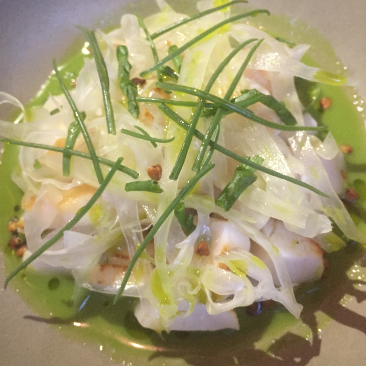The room temperature quartered Scallop dish with sea brean, fennel and green juice was enjoyable, but not outstanding ($17).