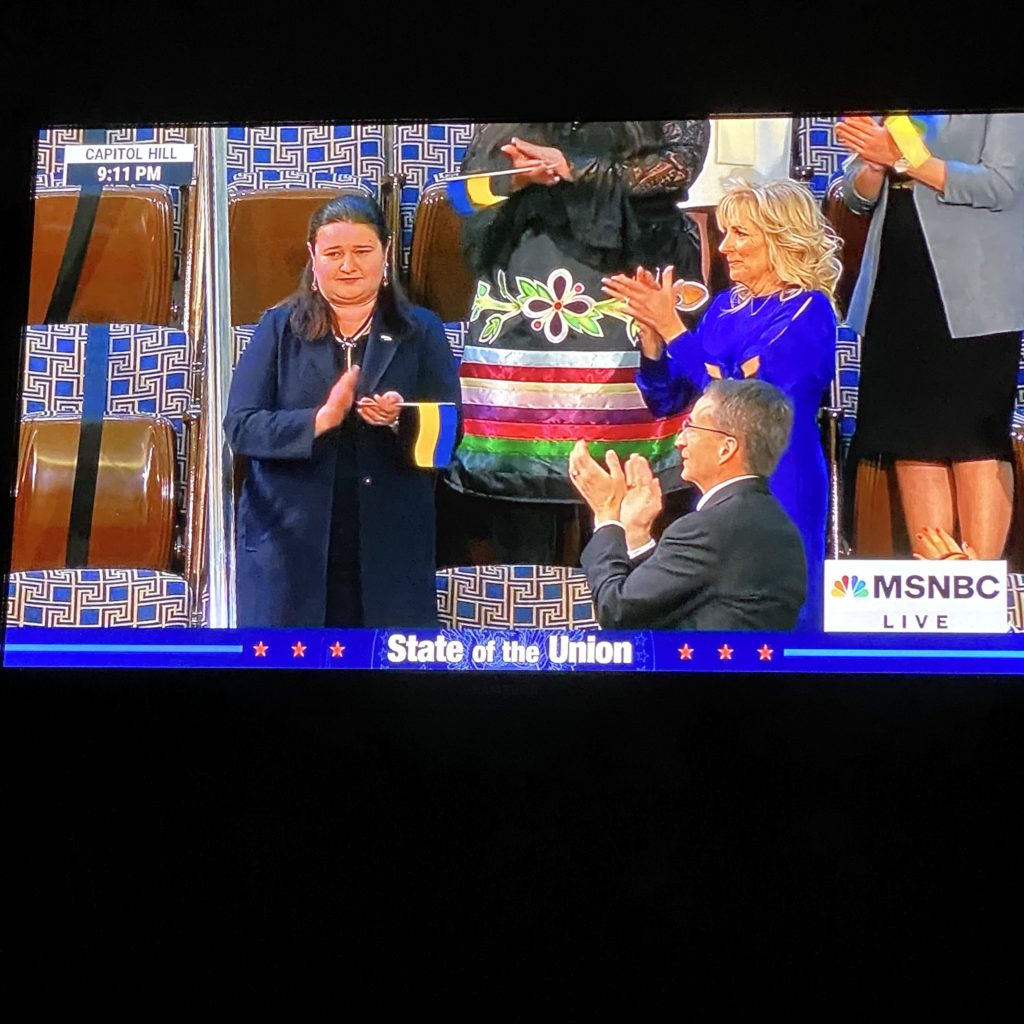 The salute to Ukraine was highlighted by the serene First Lady Jill Biden wearing electric blue and warmly embracing Oksana Markarova, the Ukrainian ambassador, as soon as she entered.