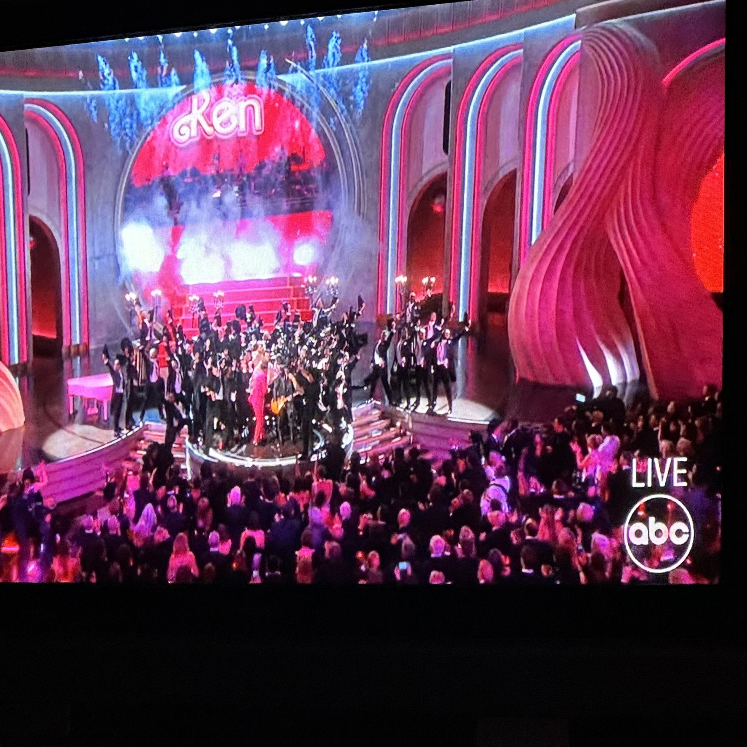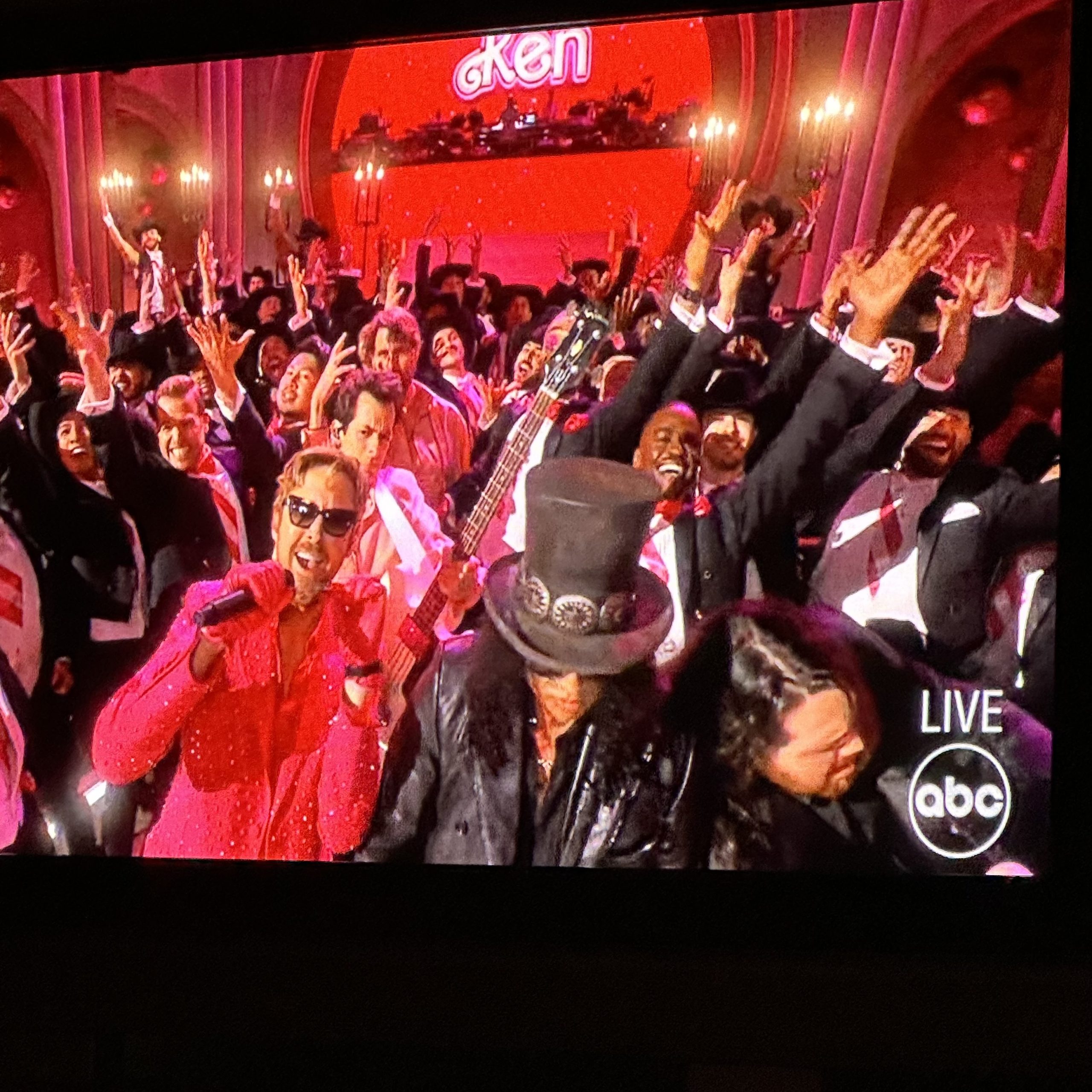 Musical moment…Ken finally upstaged Barbie with Ryan Gosling’s rousing performance of, I’m Just Ken, accompanied by Slash, Mark Ronson, Wolfgang Van Halen and dozens of Ken clones.