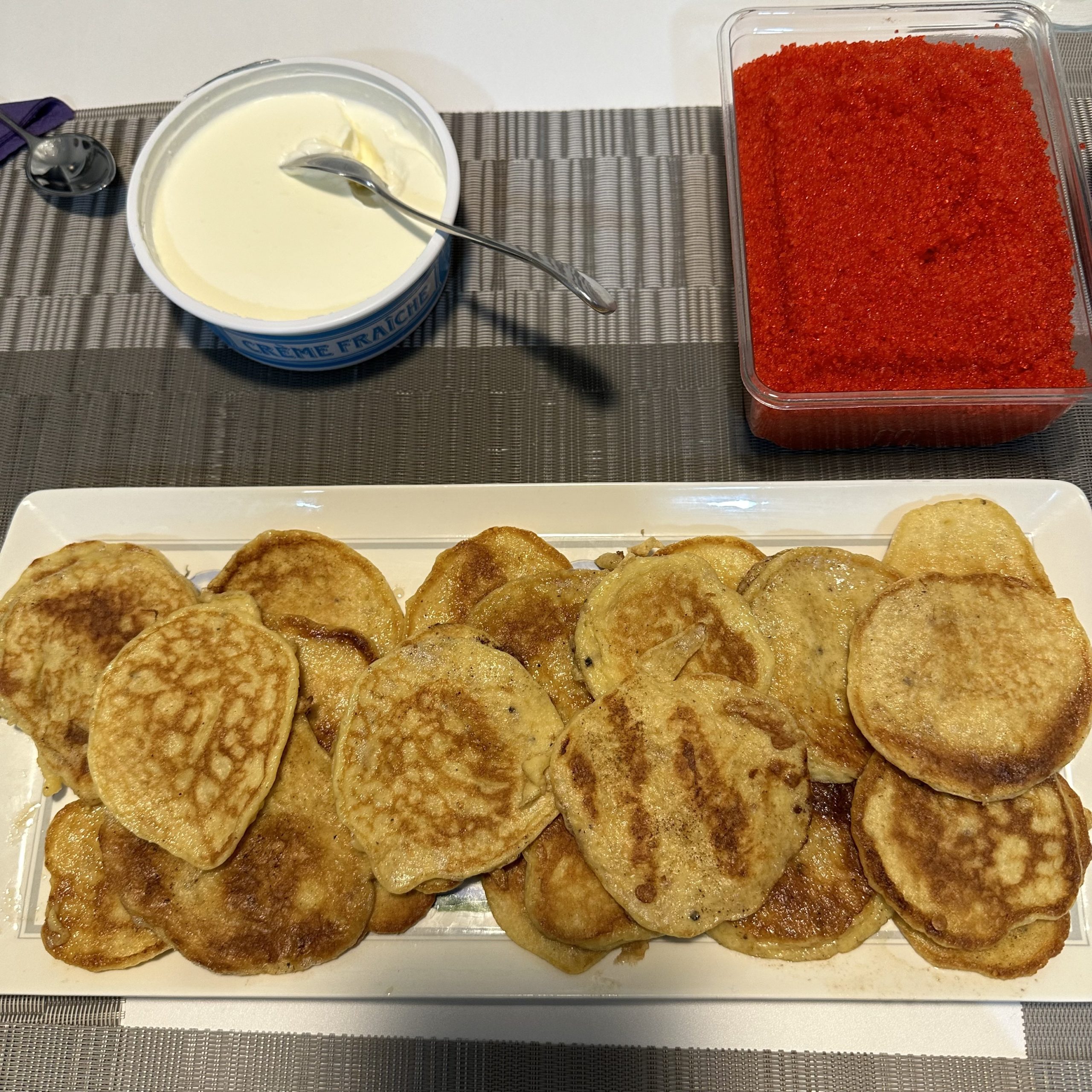 Last week I whipped up Queen E’s matzoh meal latkes which are the same as blinis.
