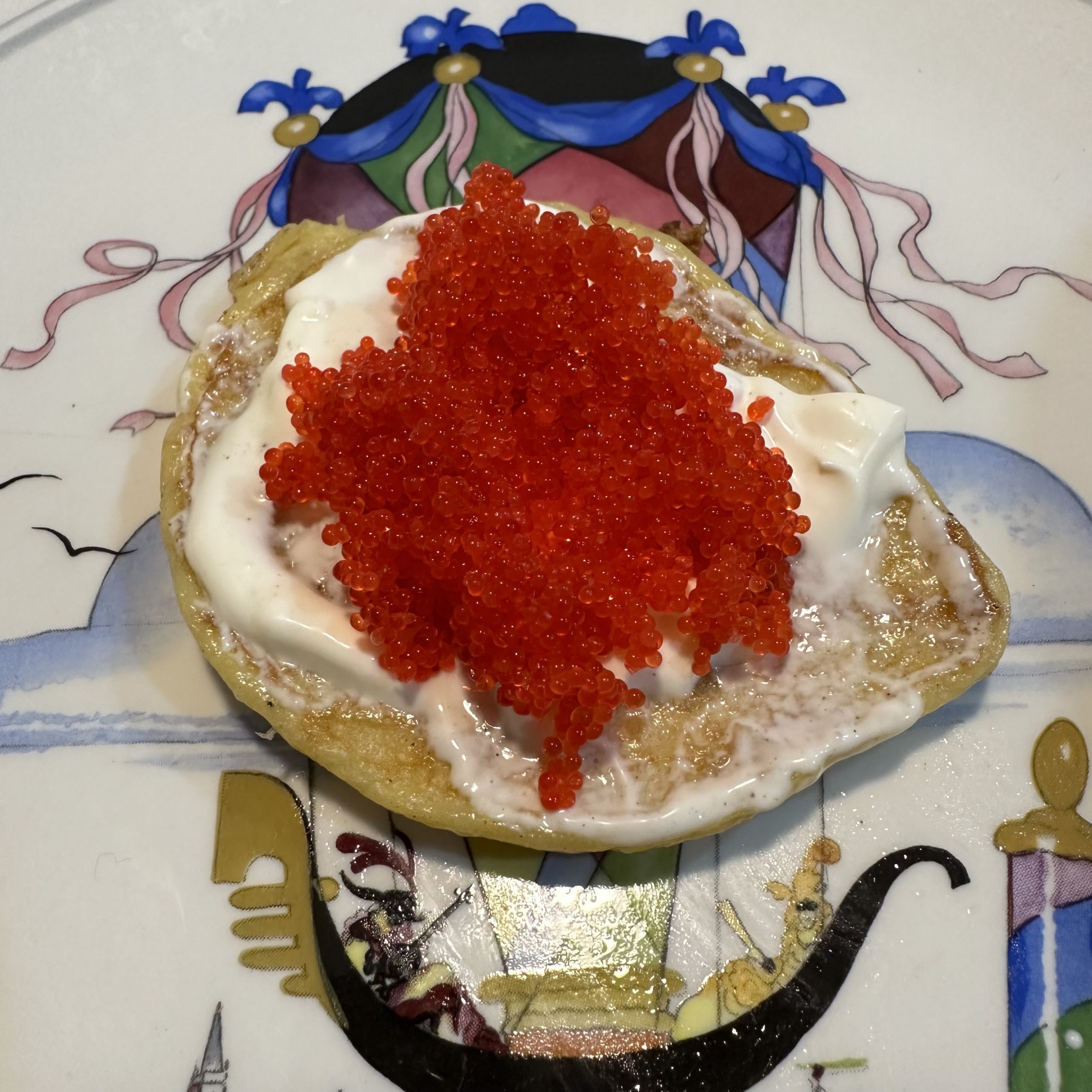 Serve each latke/blini/pancake with a spoonful of creme fraiche and a generous serving of Tobiko on top of the blini.
