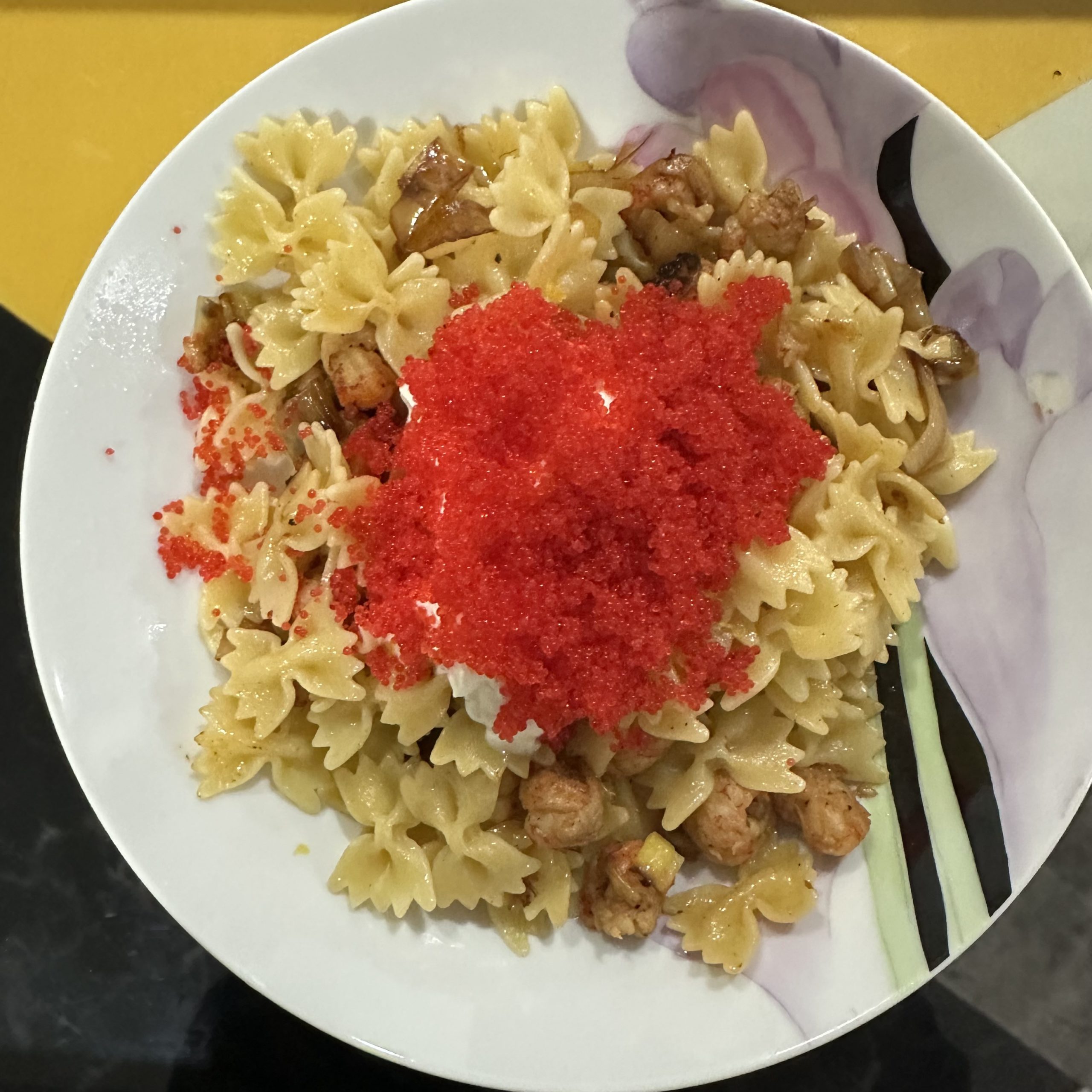 With the leftover Tobiko I whipped up bow tie pasta and served with a Meyer Lemon zest, a dollop of creme fraiche and a large serving of Tobiko.