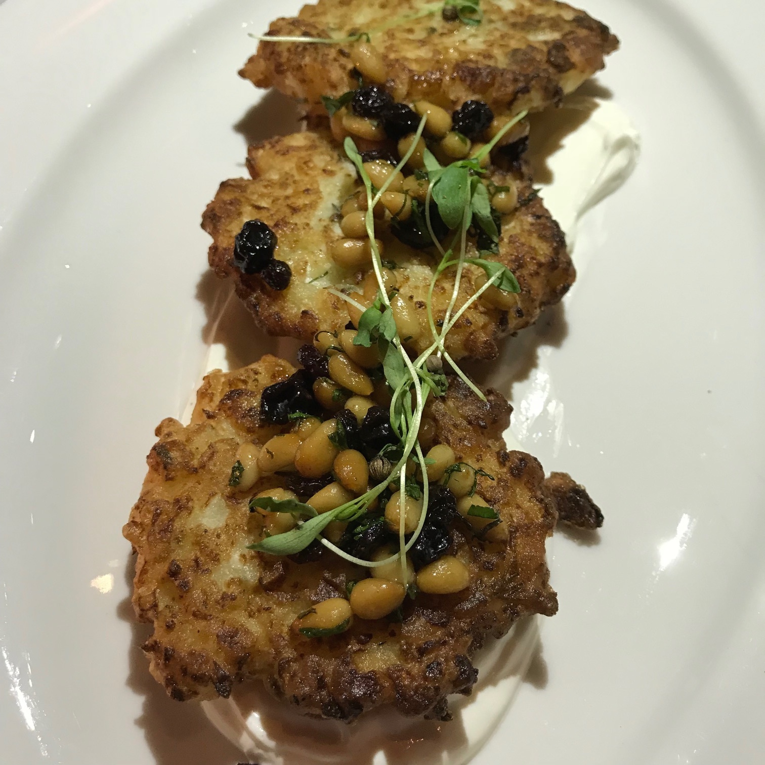 We took a breath and awaited the Hounoupidi Tiganites, crispy, hot roasted cauliflower fritters with currants, pine nuts and honey on a thin layer of amazing Greek yogurt ($15).