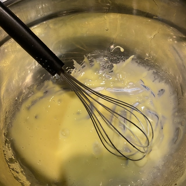 mayonnaise - Drizzle the neutral oil a drop at a time, while whisking the oil into the yolk. Very important! Drizzle in VERY, VERY Slowly. And don’t stop whisking.