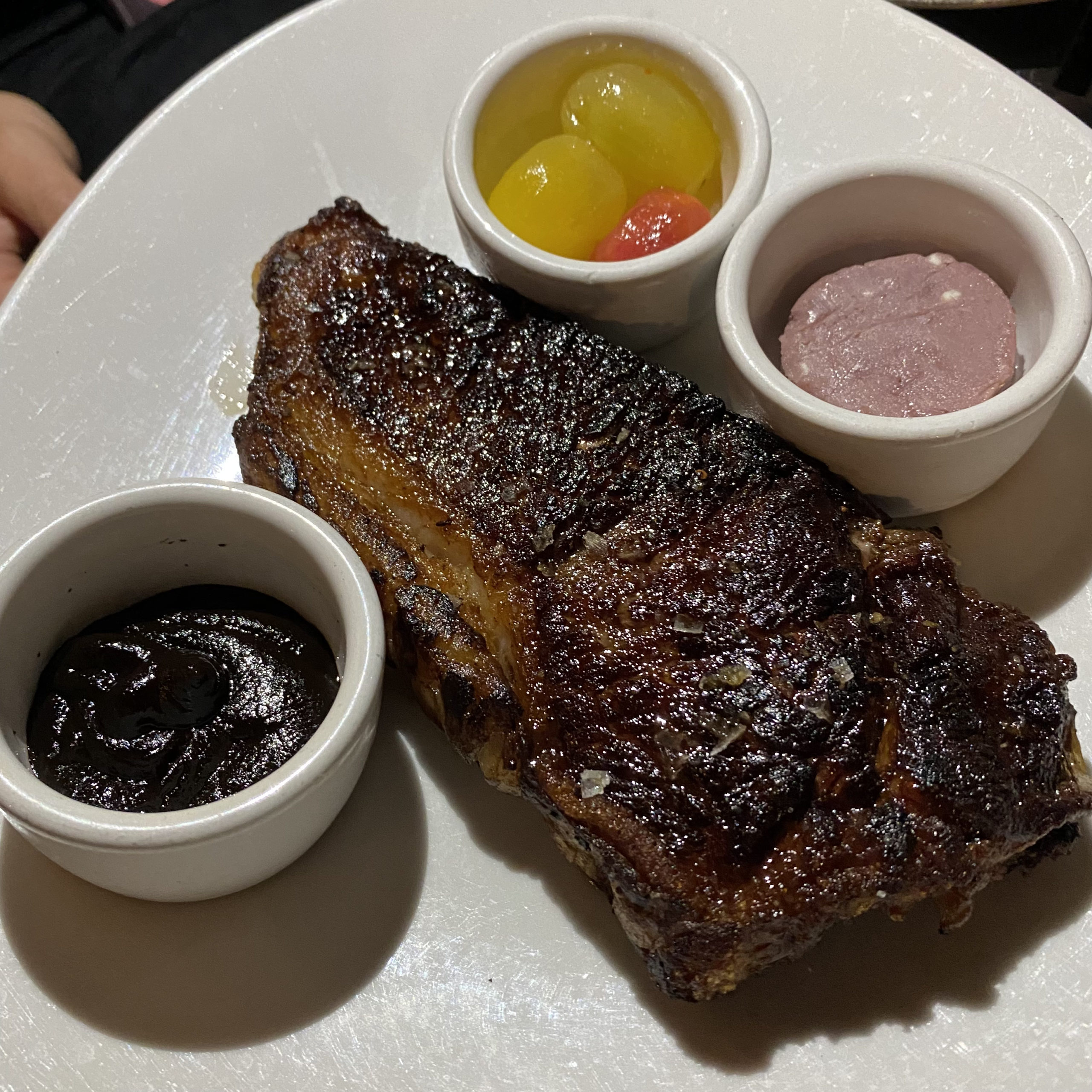 My daughter and I shared a mouthwatering steak with a great sear, a rich red wine butter, a confit of garlic and fresh tomatoes ($28).