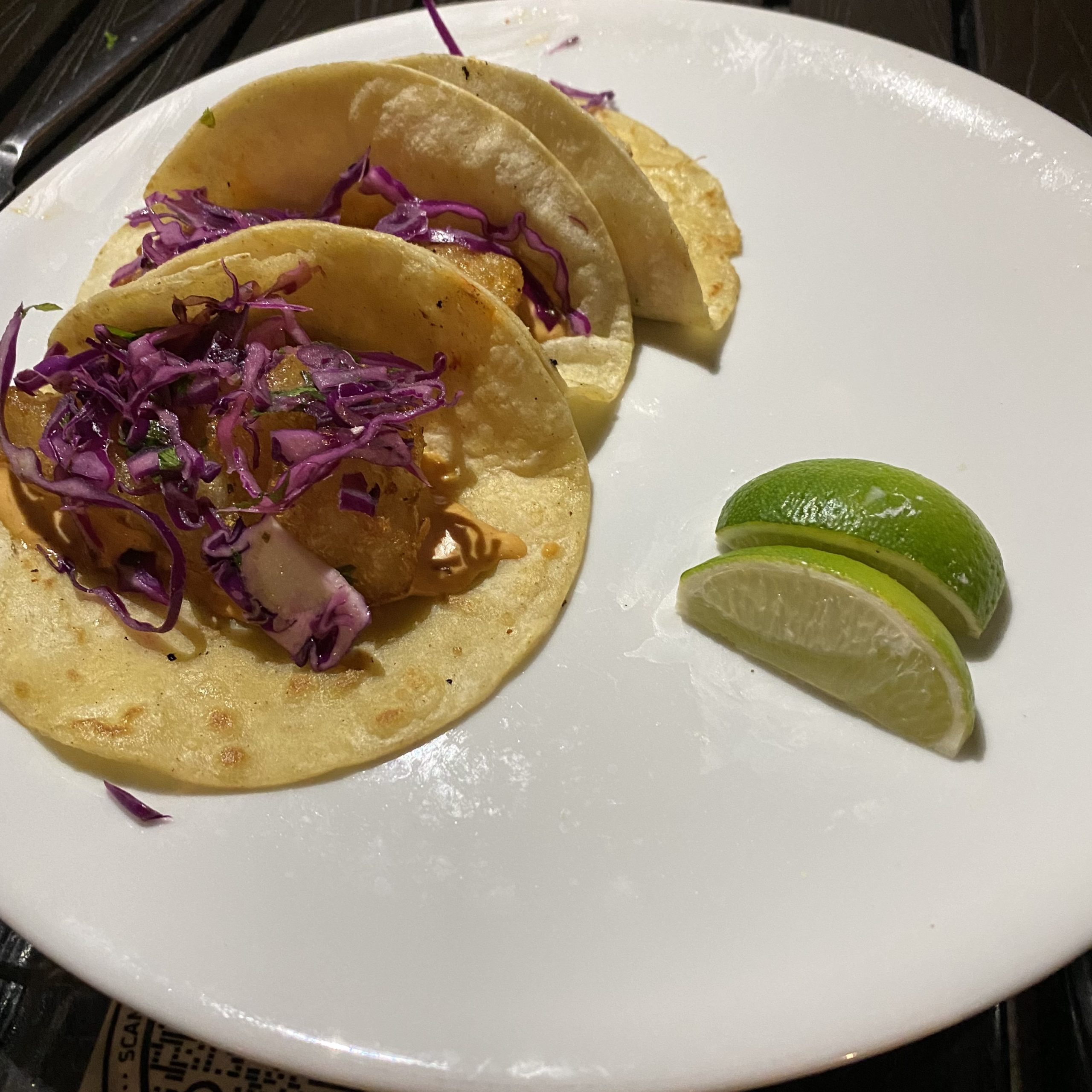My husband loved his crispy fish tacos with red cabbage, chipotle mayo and cilantro ($19).
