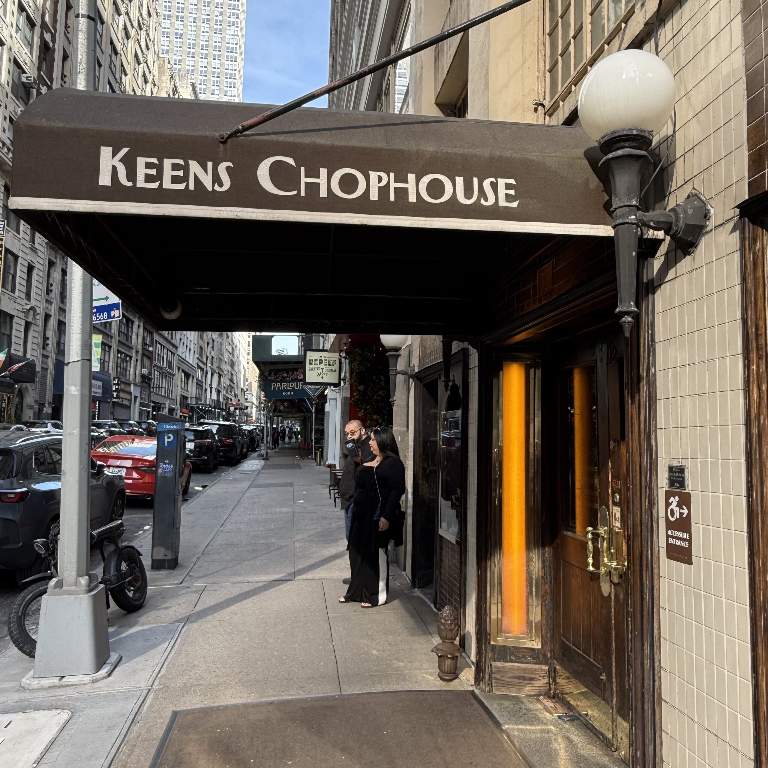 Keens Chophouse 72 West 36th Street New York City. Open Monday-Friday 11:45am-10:39pm, Saturday 5-10:30pm, Sunday 5-9:30pm. Reservations on Resy.