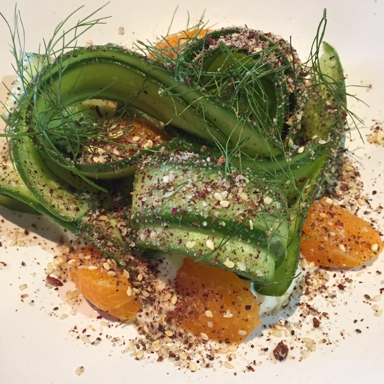 Our next selection was Persian Cucumbers with citrus, rosewater labneh and parsley seed za’atar ($14).