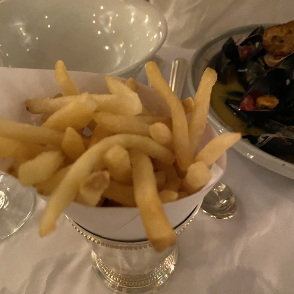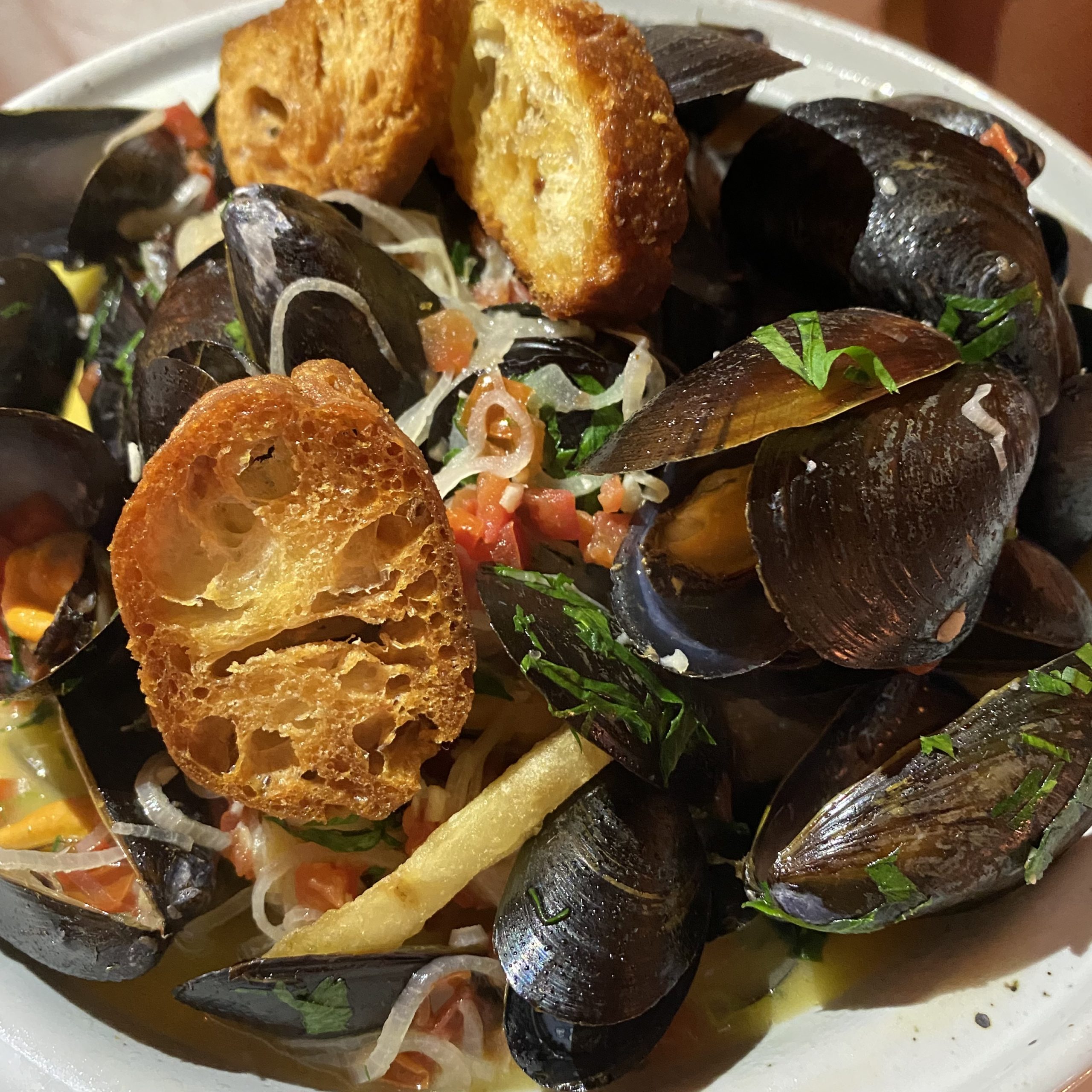 David’s Moules Meunière portion was gigantic. The mussels were in an amazing white wine and fresh diced tomato broth perfectly seasoned and accompanied by a large cone of crispy french fries ($36).