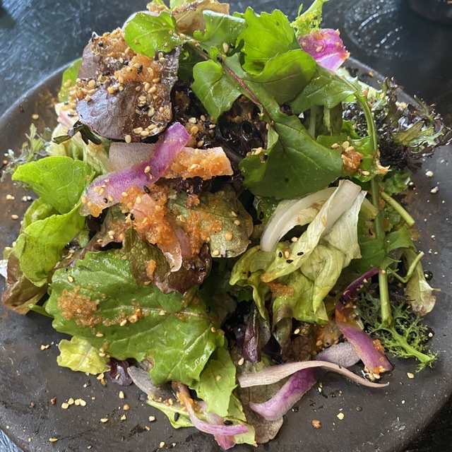 We jointly kicked the meal off with a salad that was tasty, but a mere pile of uninspired market lettuce with carrot ginger dressing, hemp seed (WTF) and a meager portion of Sichuan radish ($13).