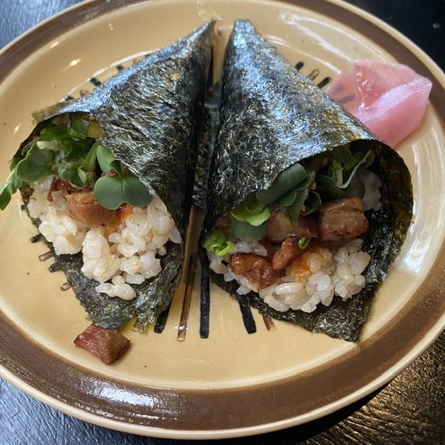 I was foolishly tempted by the Pork Chashu because the hand roll claimed to have burnt ends and I enjoy charred meat, but no truly crispy ends were to be found among the pickled cucumber and fermented chili sauce ($15).