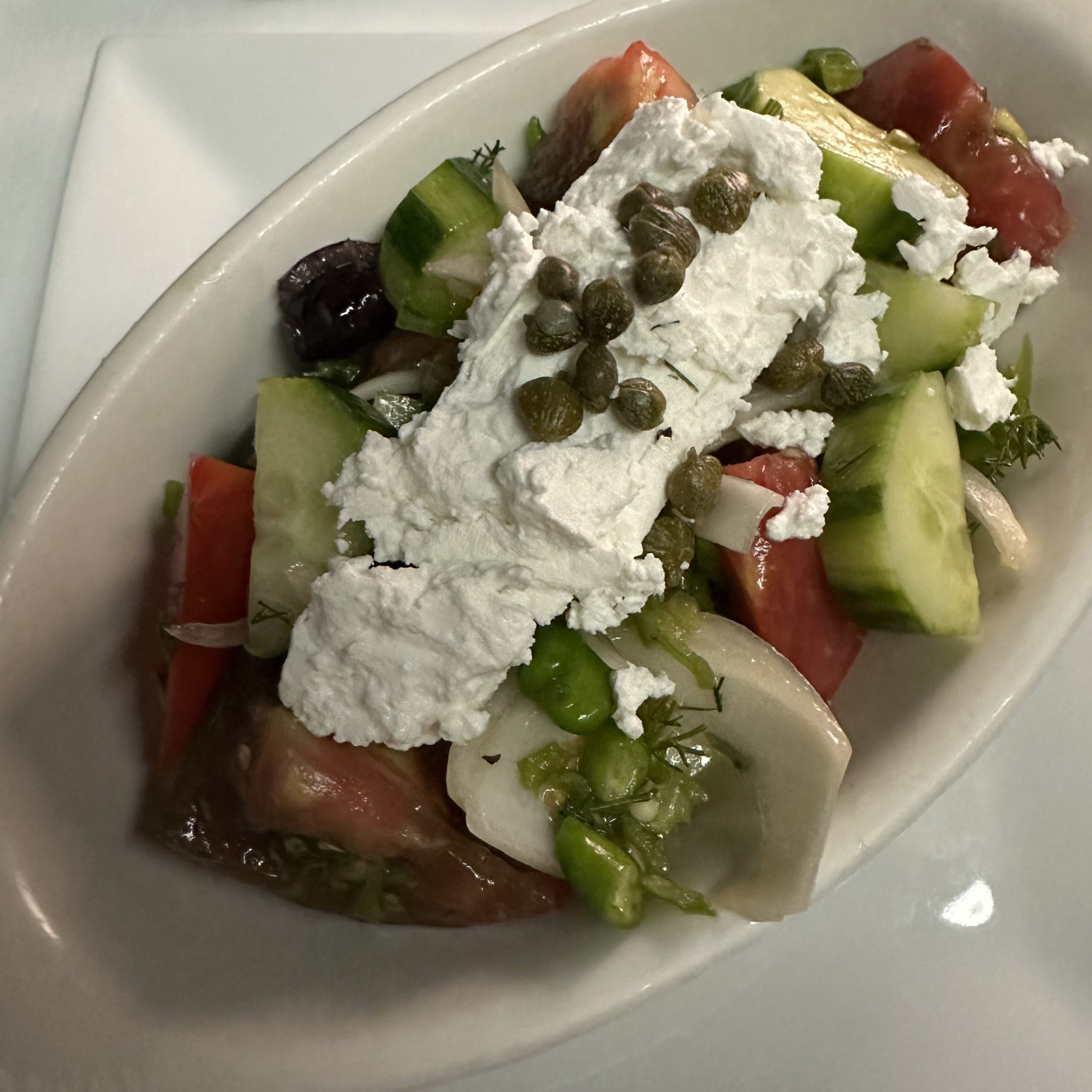 We started with a luscious Farmhouse Tomato Salad with cucumbers, onion, olives, Greek style feta and capers ($17).