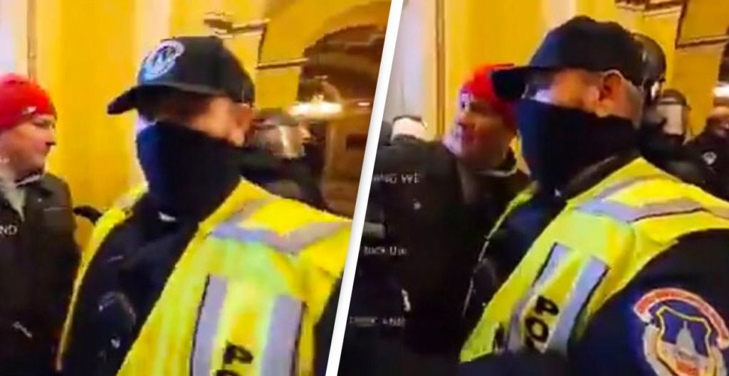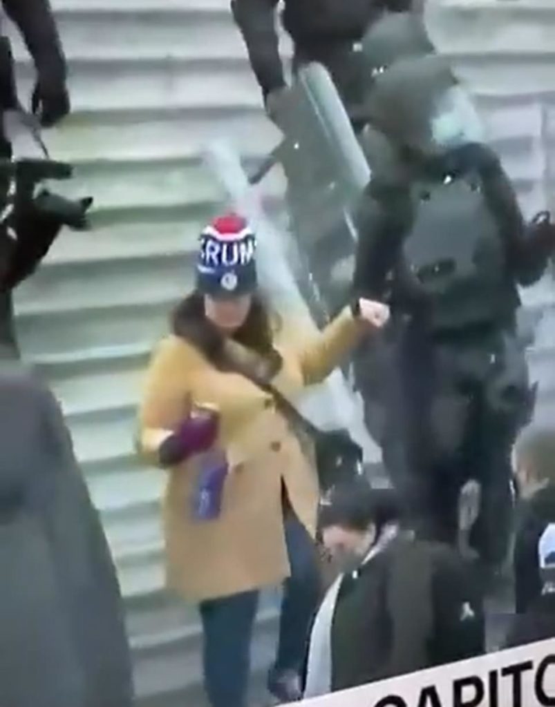 Police lending a hand to a pregnant white female agitator going down the Capitol steps.