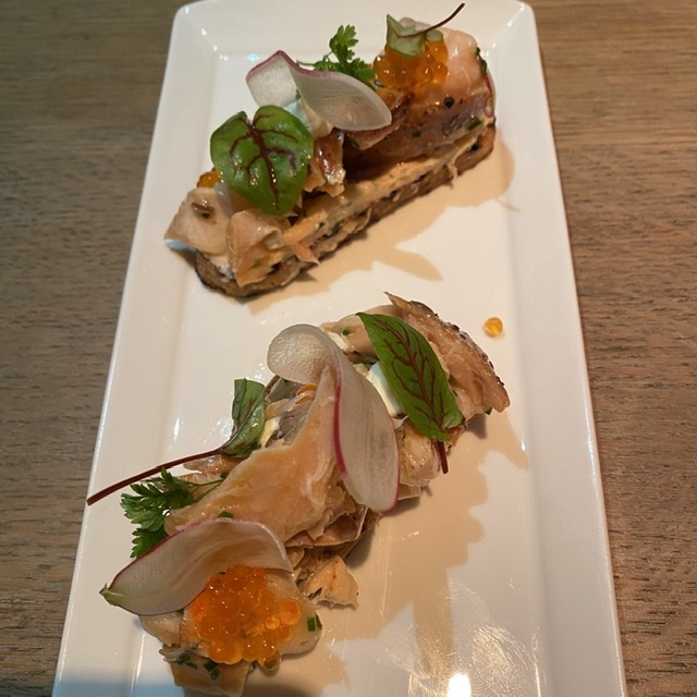The following course was an outrageous Breakfast Bruschetta with warm smoked salmon fillet and trout roe layered with mascarpone…amazing ($17).