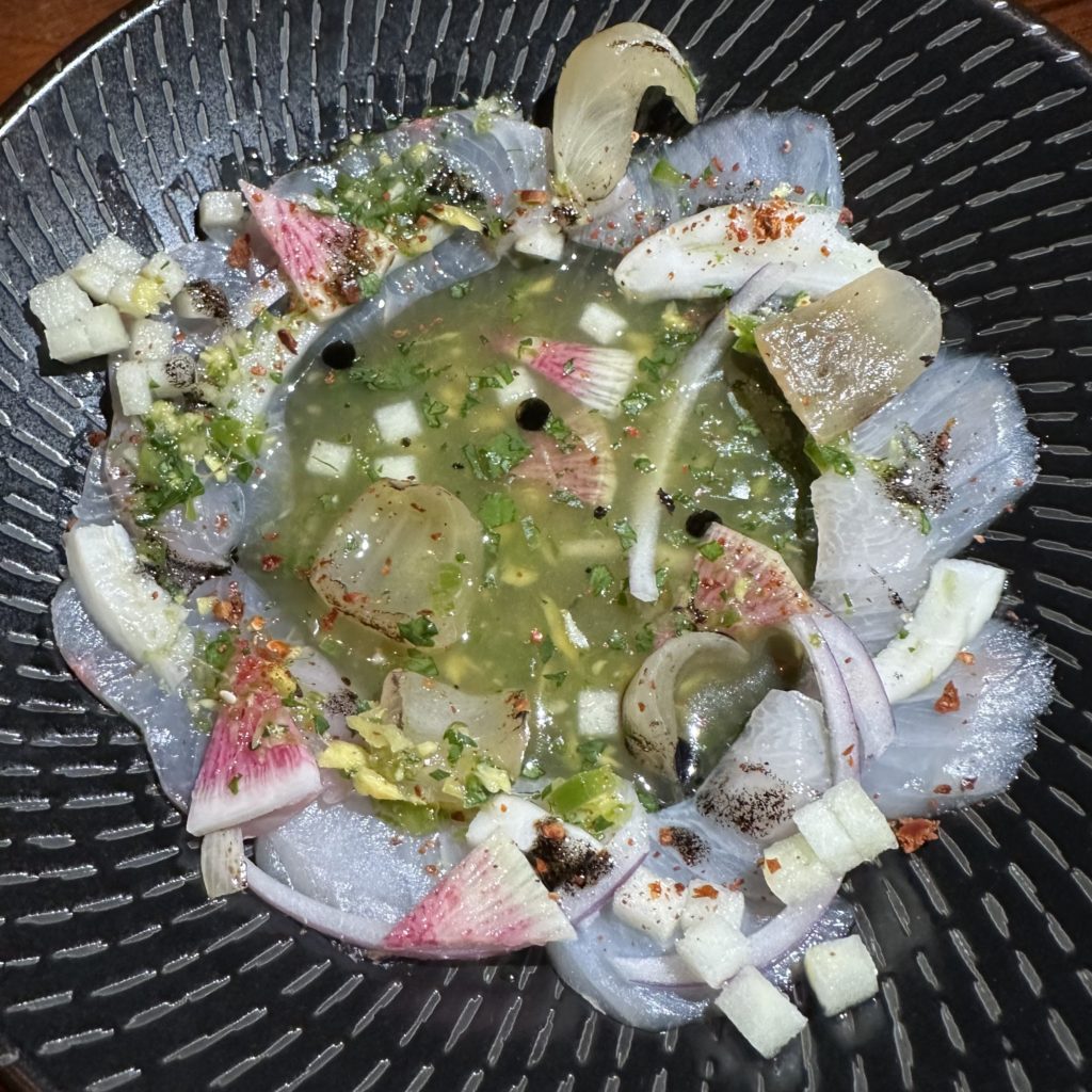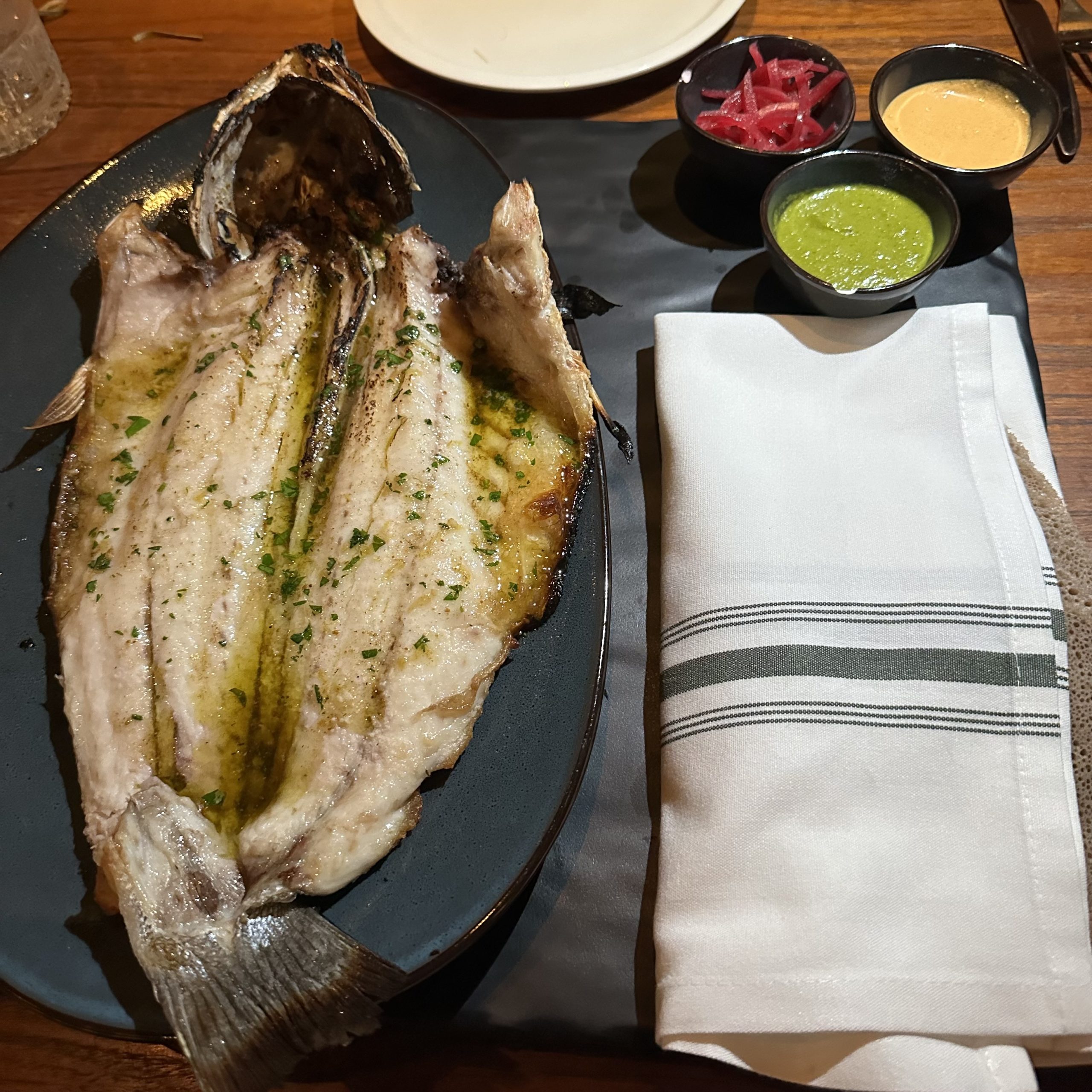 The Whole Branzino was superb with berbere crema, salsa verde, pickled red onion, housemade blue corn tortillas and delicious toppings. The Branzino is one of the best fish dishes I have ever ordered ($52).