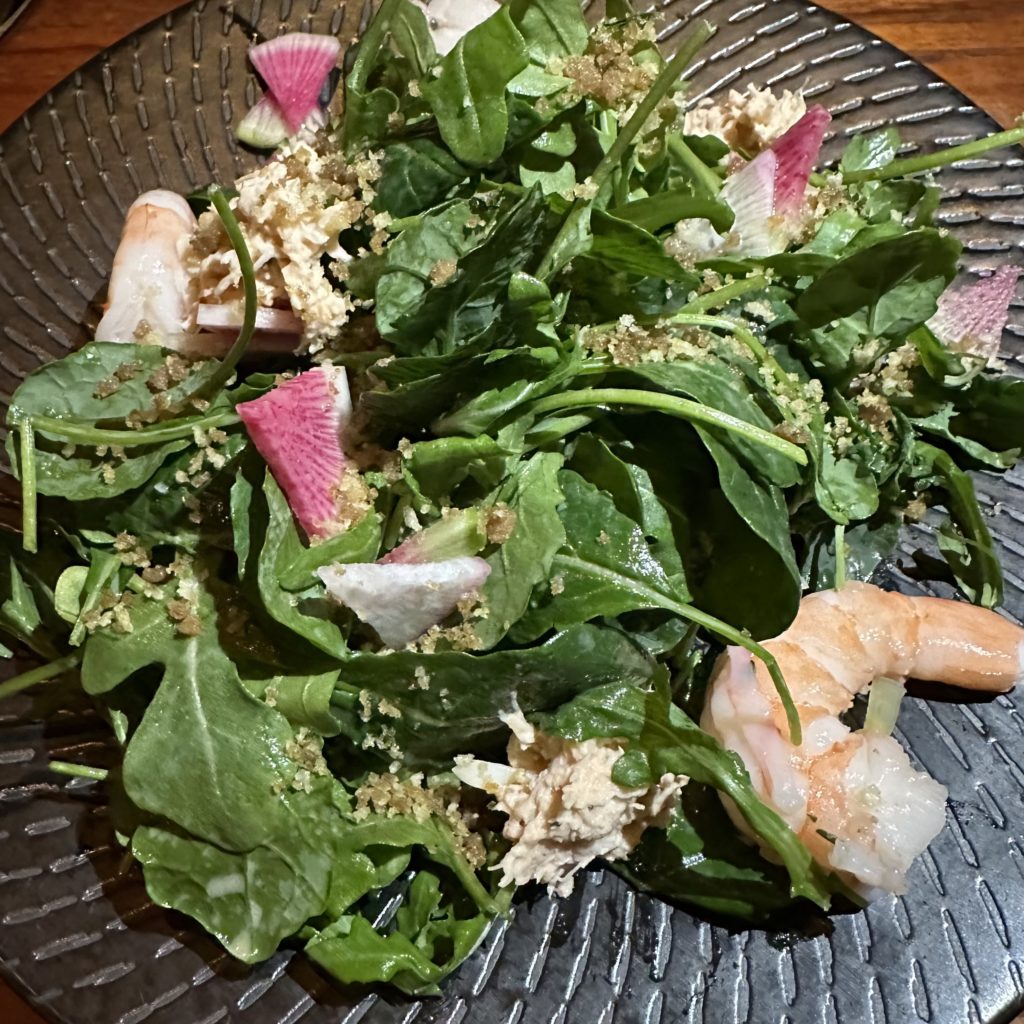The Ocean Salad with baby kale, rock shrimp, jumbo lump crab, injera crumble was fresh and crunchy, but, again it did not resonate. We all desired a salad and initially preferred this one to the Autumn Salad ($19).