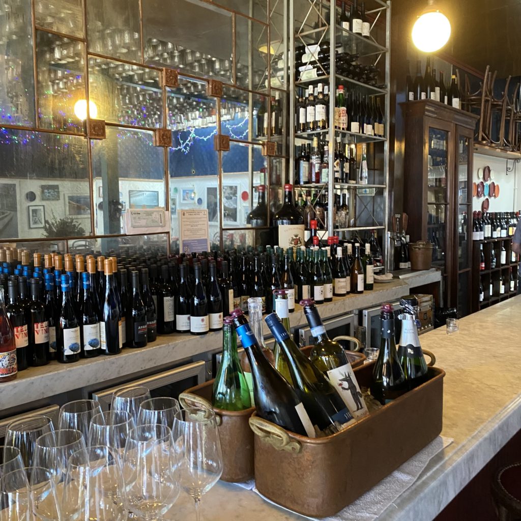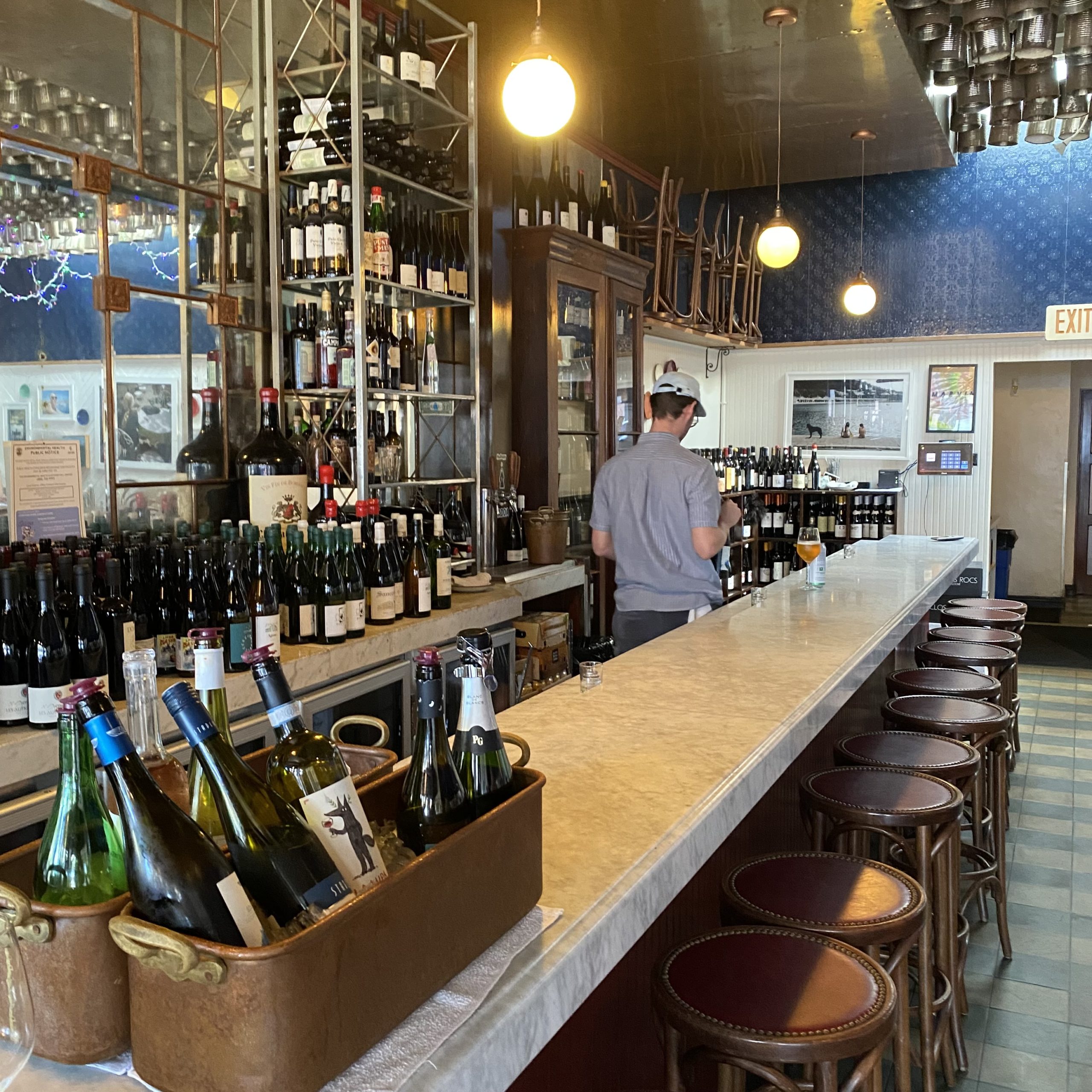 Upon arrival I entered a simple, rather bare bones restaurant, featuring a bar lined with a plethora of wine bottles (allegedly over 200), backless stools and a ceiling filled with aluminum tomato cans.
