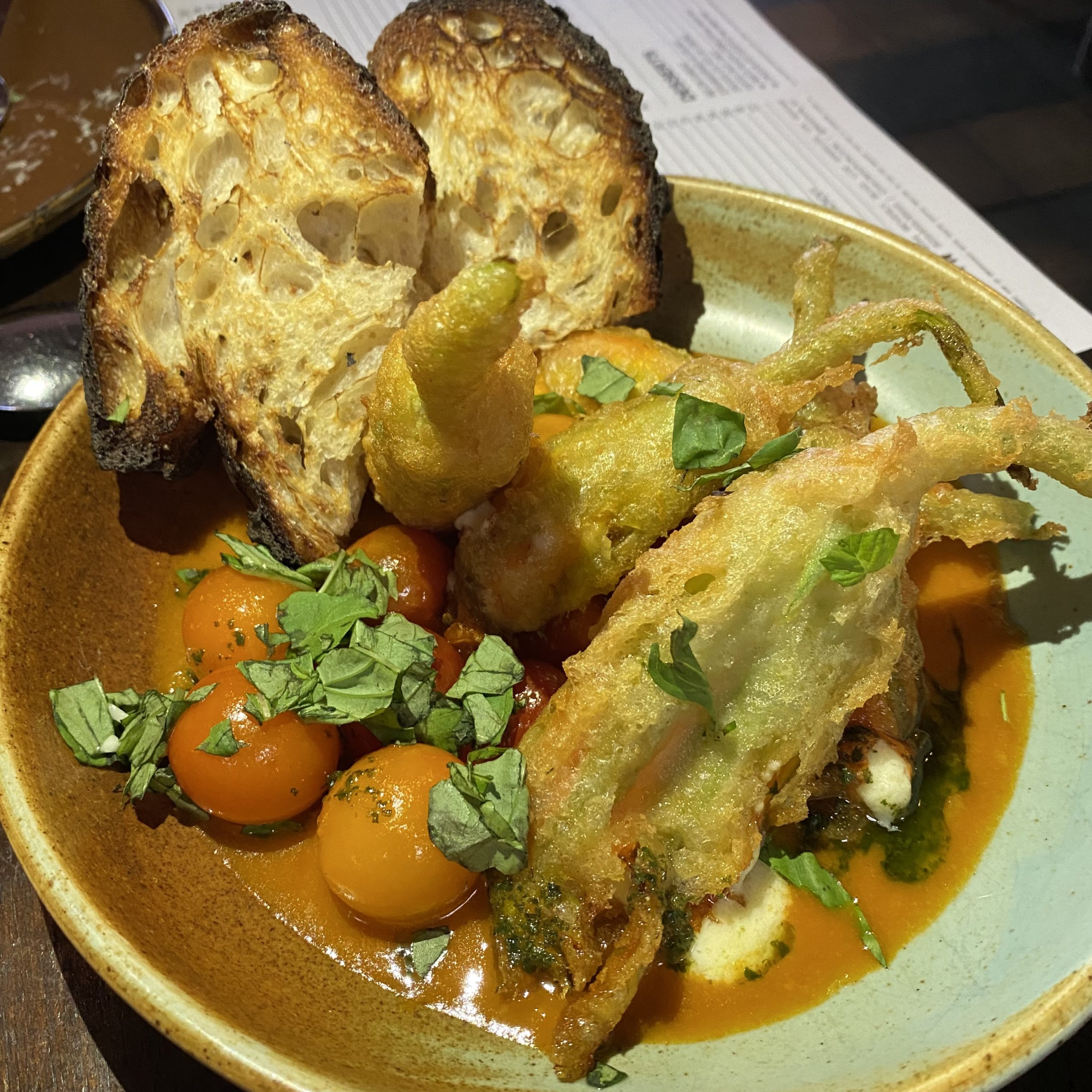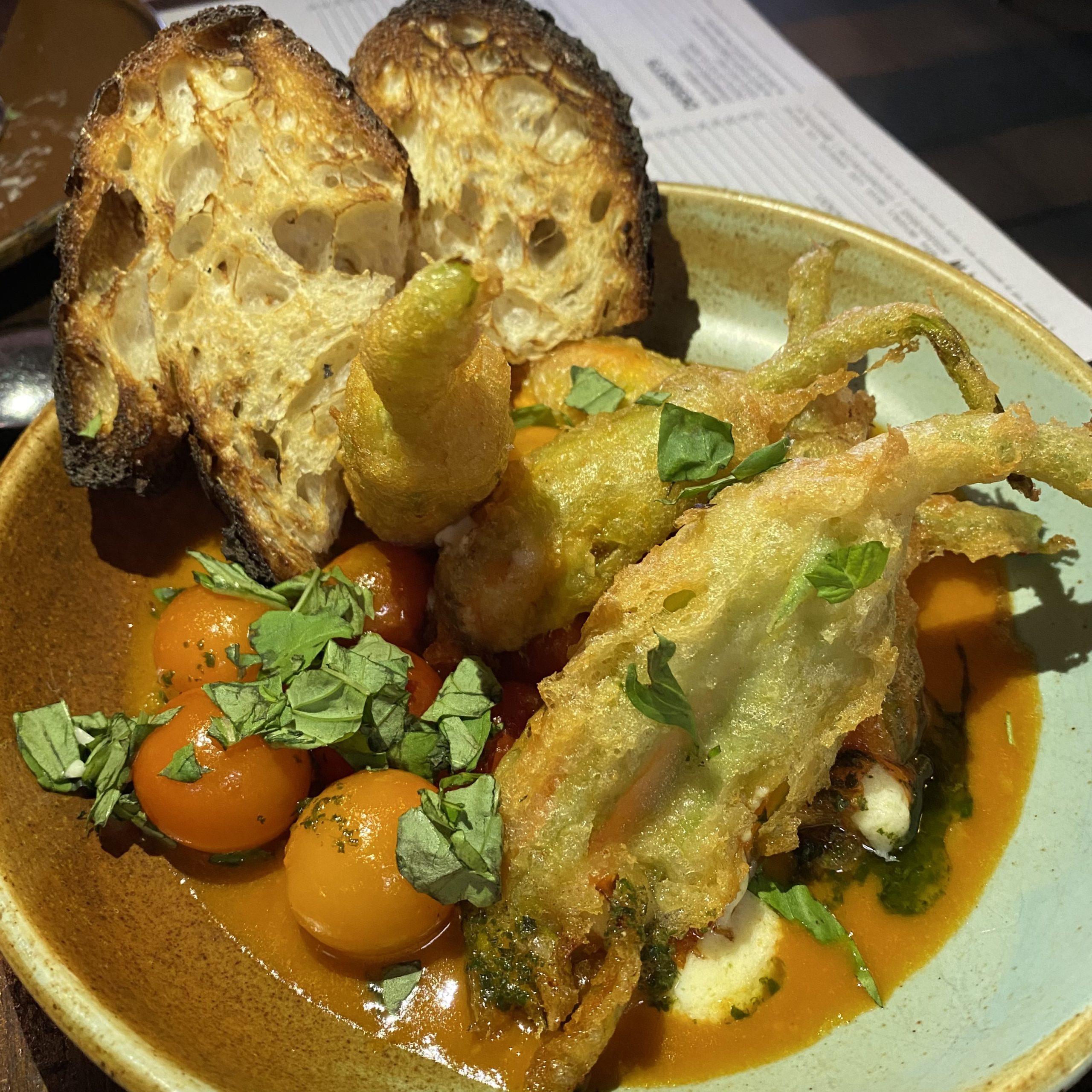 The Fried Zucchini Blossoms, a vision with warm, oozing cheese and perfectly fried squash blossoms bathed in a fabulous pomodoro sauce, was ecstasy and the smattering of plump cherry tomatoes divine ($20).