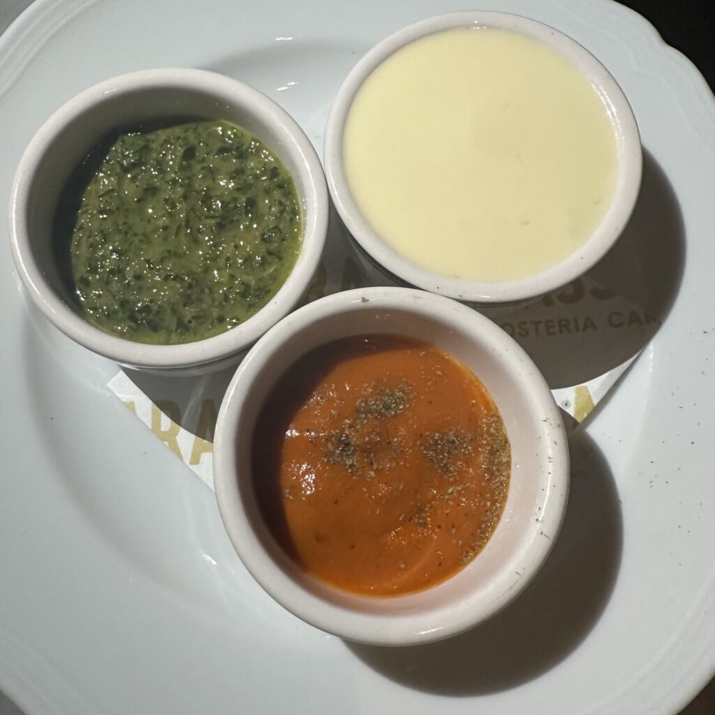 The fish arrived with a trio of sauces…zabaglione, herby salmoriglio and puttanesca ($78).