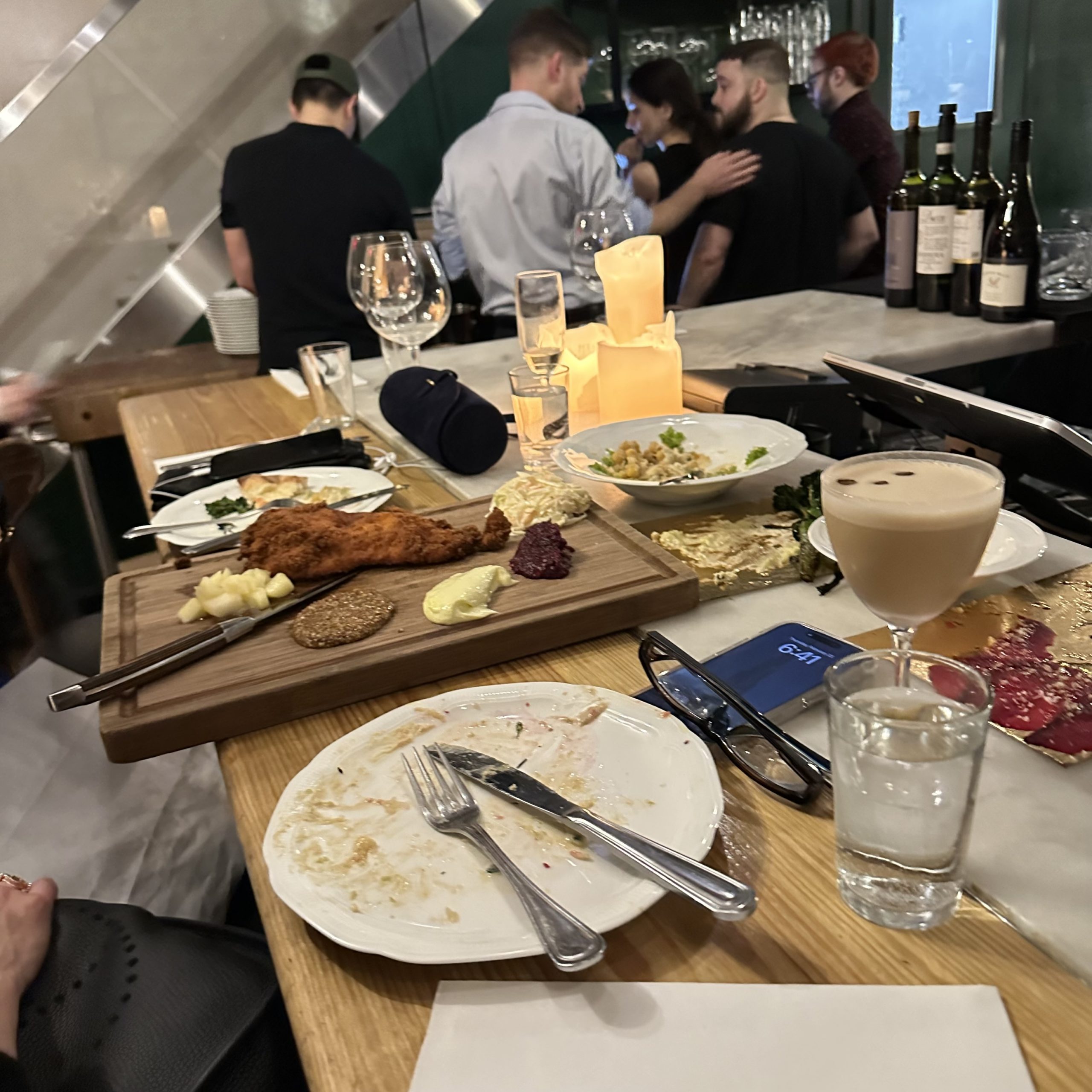 Apparently the Schnitzel stuffed with bone-marrow mashed potatoes is a favorite served on a giant chopping board with cole slaw and horseradish ($41).