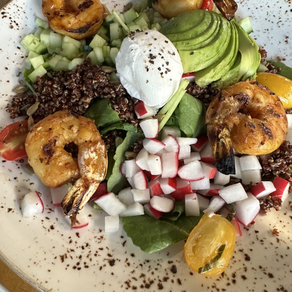 My daughter selected the Grain Bowl with farro, quinoa, avocado, baby kale, radish, cucumber, sunflower seeds and a poached egg ($20). She added delicious grilled jumbo shrimp ($10).