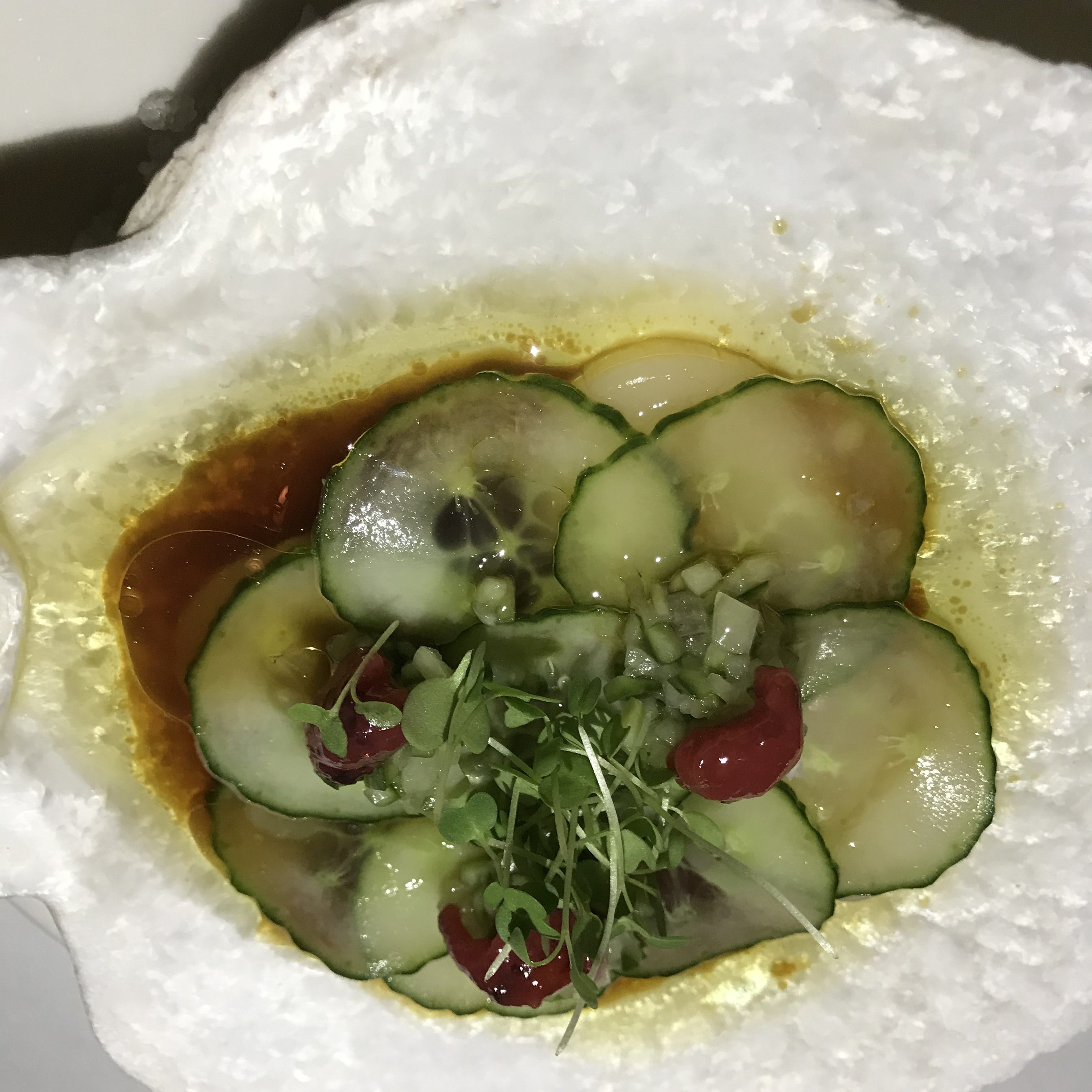 We shared the luscious Scallop Crudo with cucumber, wood sorel, spicy ume boshi and brown butter ponzu ($18).