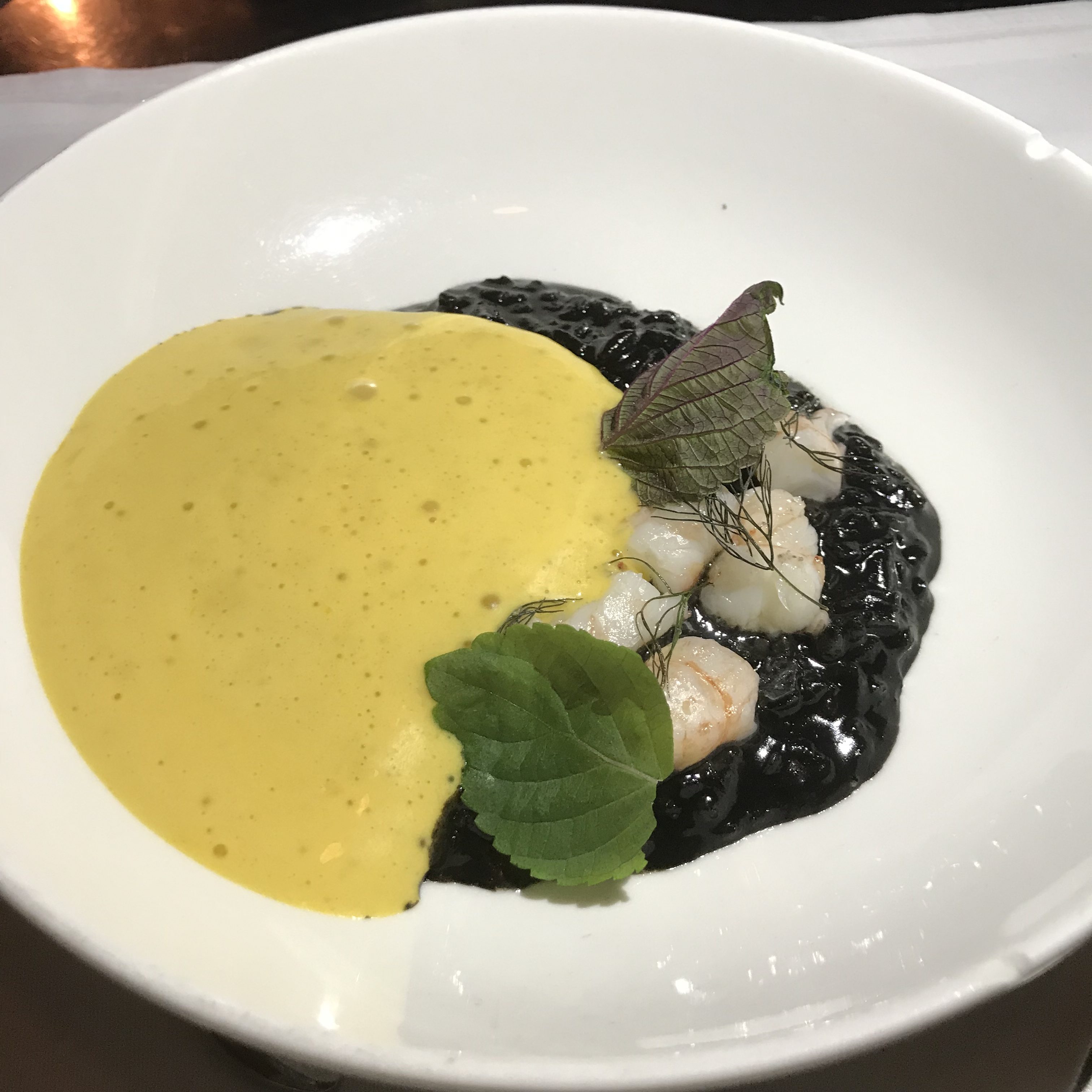 David selected the luscious Langoustine served over squid ink risotto, bouillabaisse and fennel ($31).
