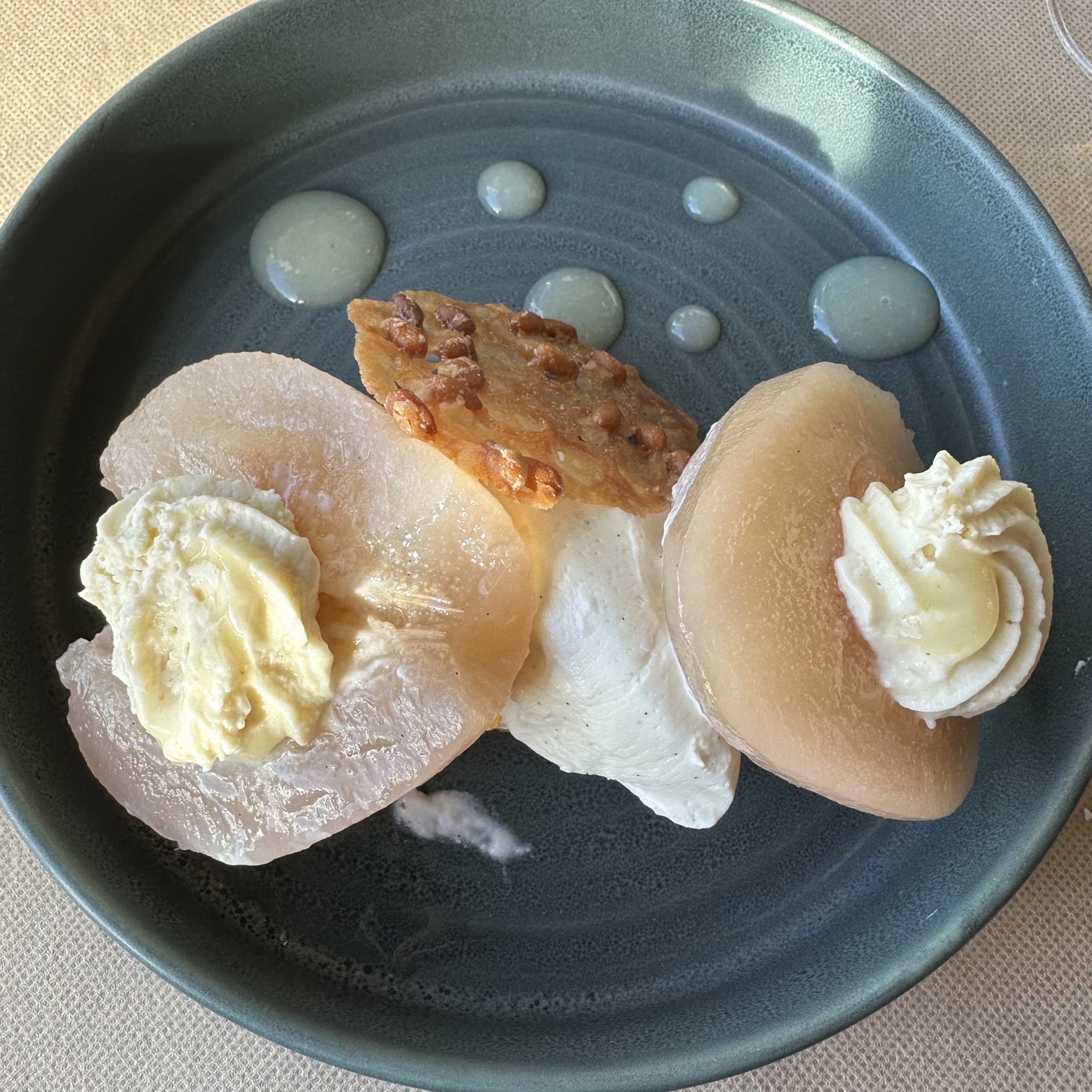 Beyond decadent Poached Pear with the best Vanilla Ice Cream and Olive Oil Cake.