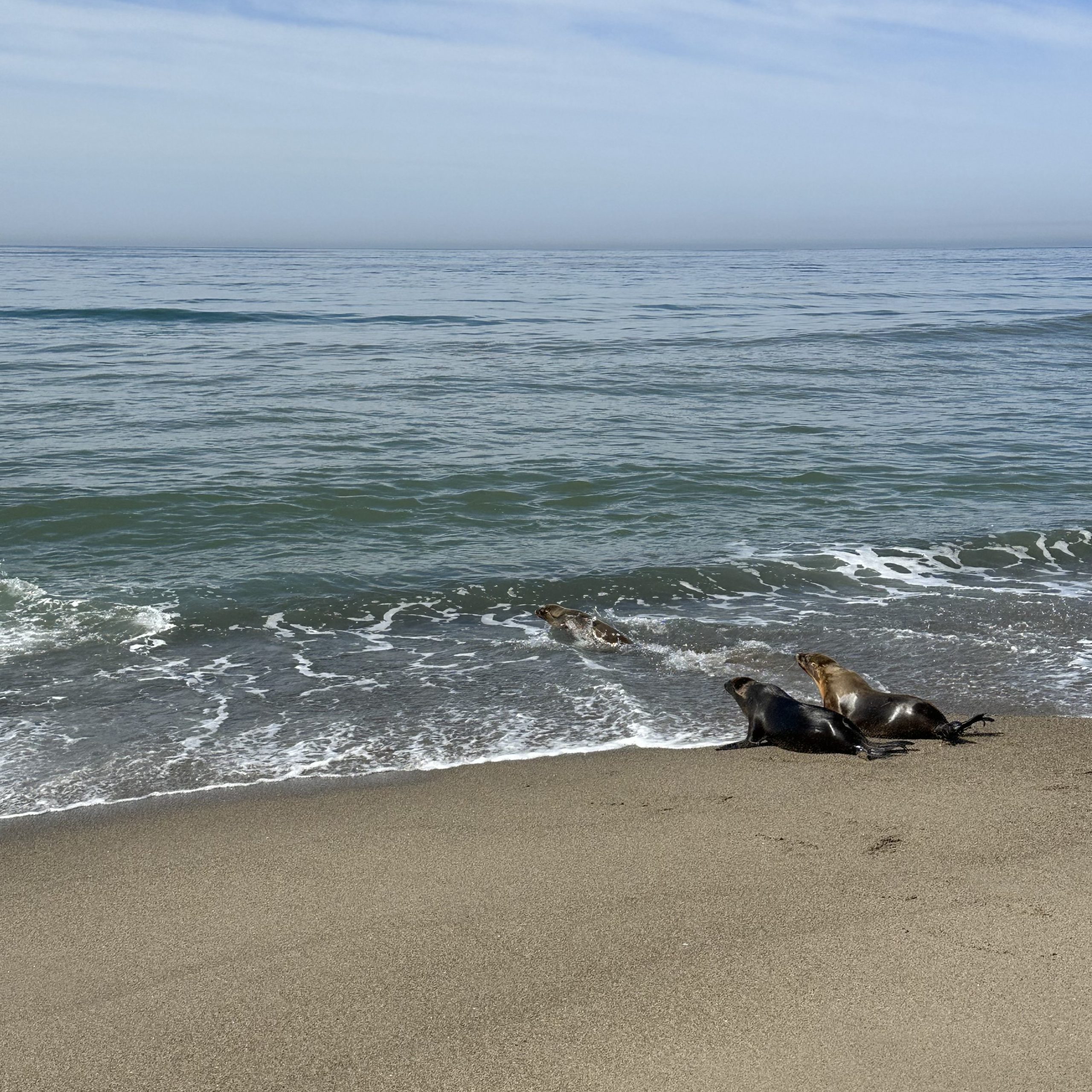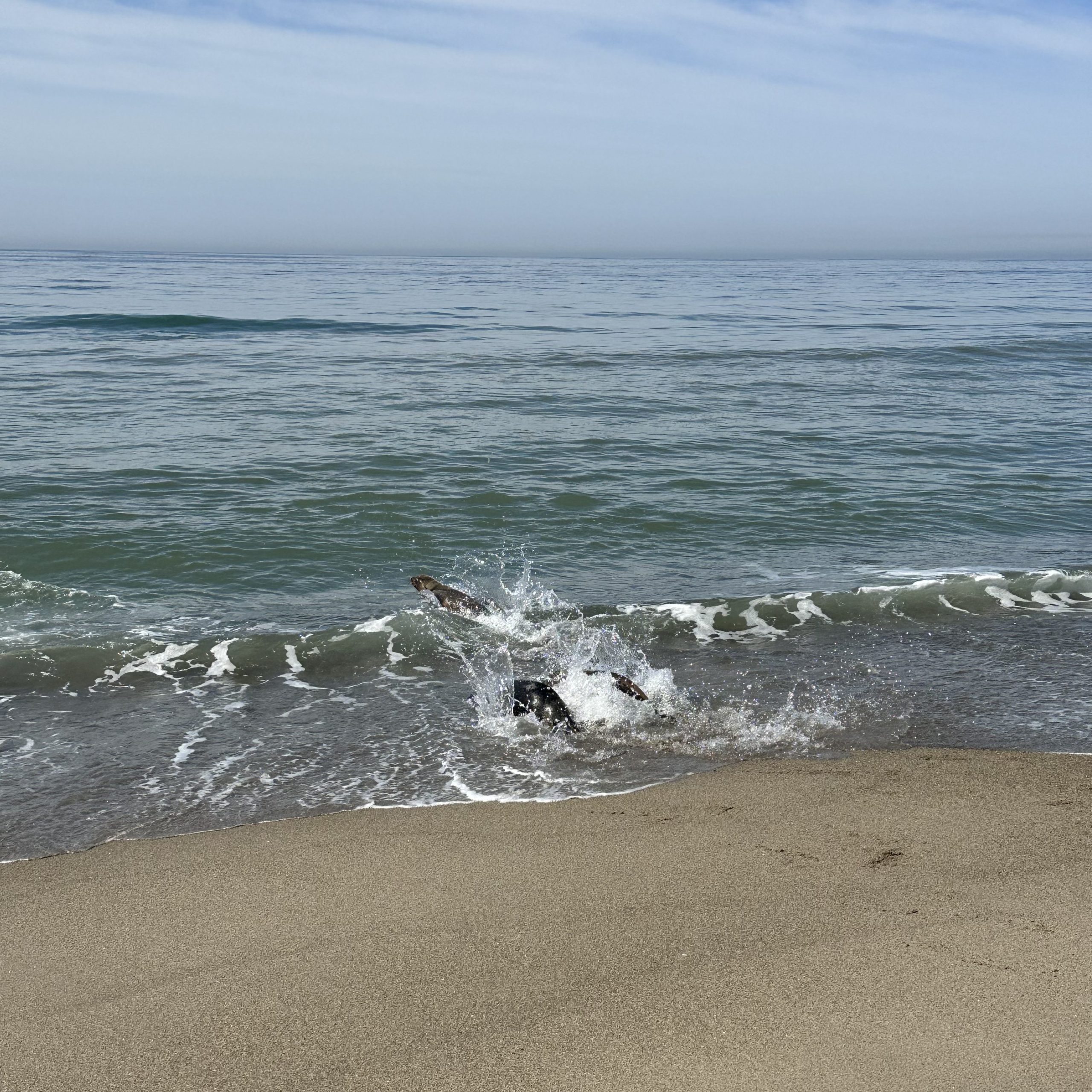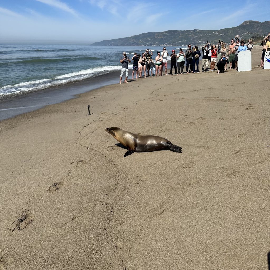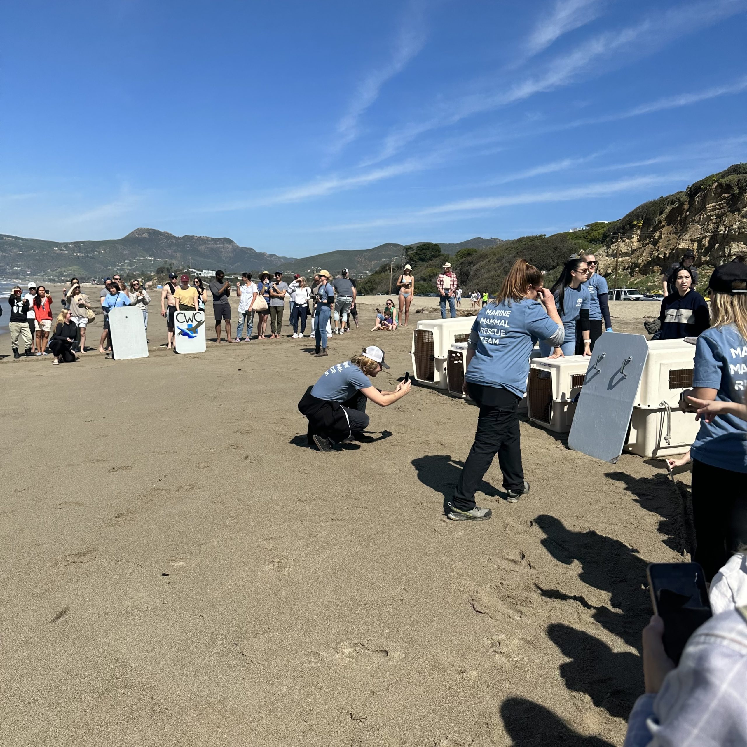 I was reading on an empty beach in Malibu. I looked up to see several Marine Mammal Rescue volunteers magically appear, transporting 5 heavy kennels and placing them side by side near the shoreline.