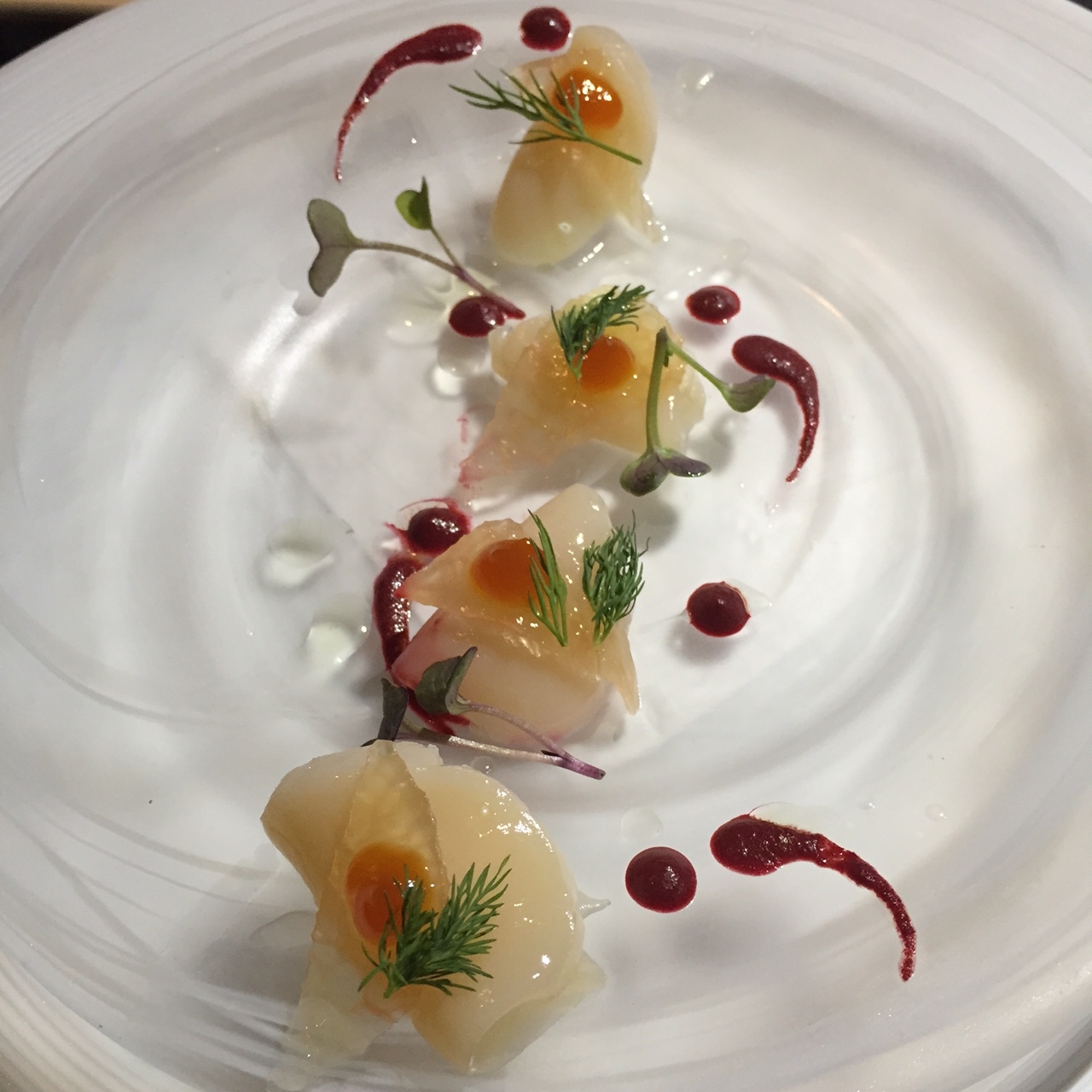 JAPANESE SCALLOP WITH PAMELO, DILL, BELL PEPPER GELEE, BEET AND SORREL PESTO