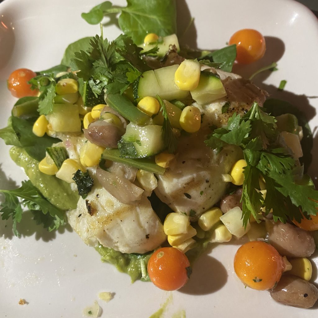 The Grilled Local Halibut with avocado cream and succotash salsa was delectable and by far the best dish ($25).