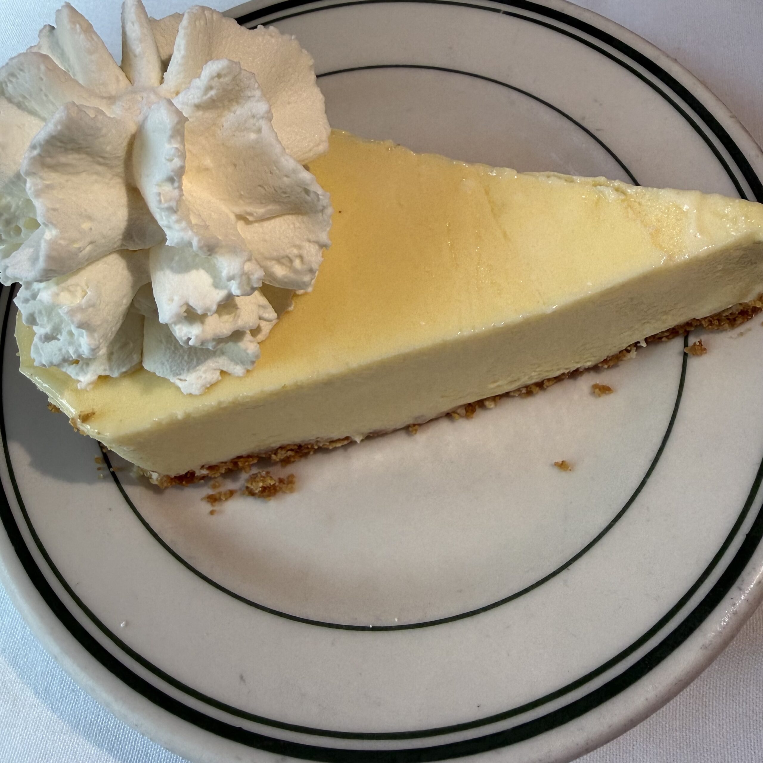 Tall, tart, creamy, and crowned with a generous cloud of real whipped cream, it is rich enough to feel indulgent, and somehow light enough that you immediately begin rationalizing another slice and that crust ($14.95).