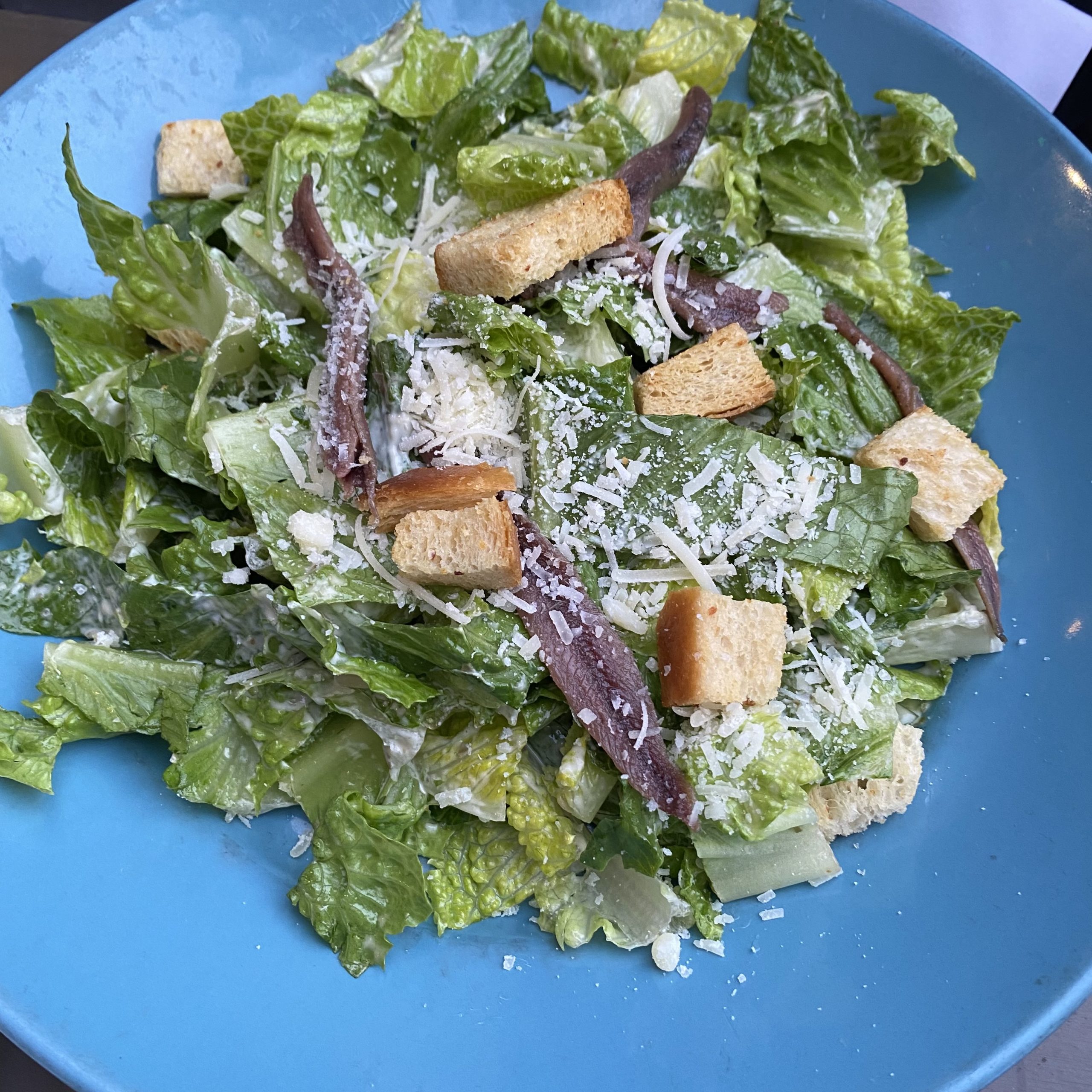 We ordered wine and kicked off dinner with a Caesar Salad with anchovies, croutons and Parmesan which was bountiful and satisfying ($12).