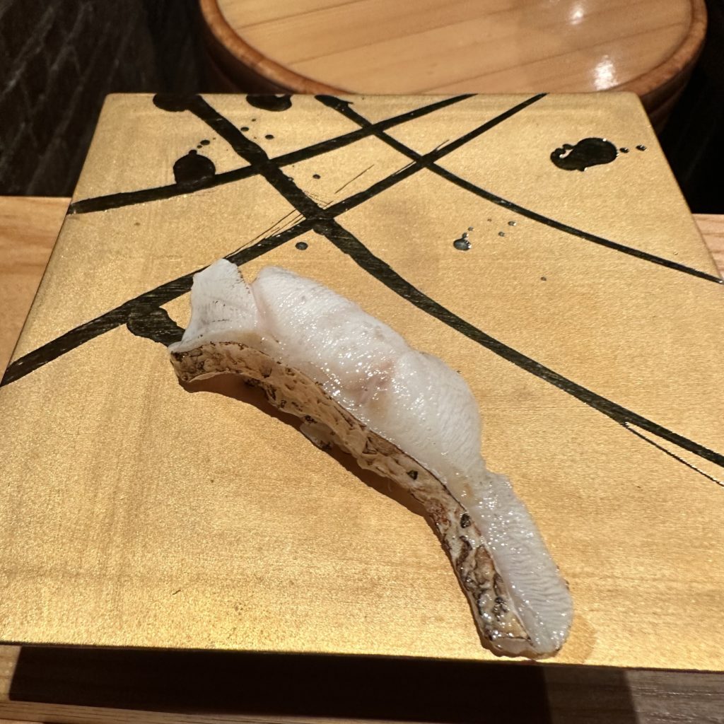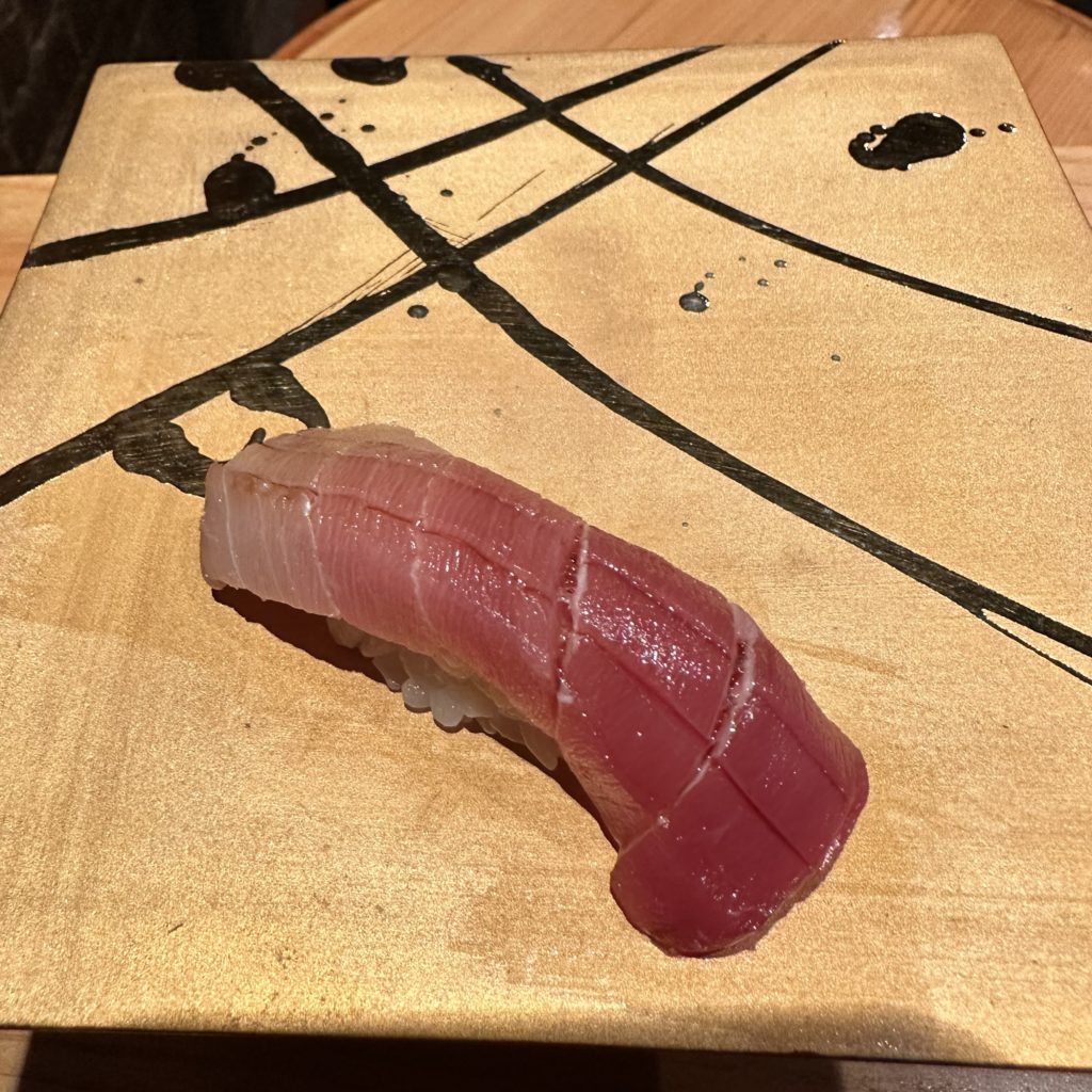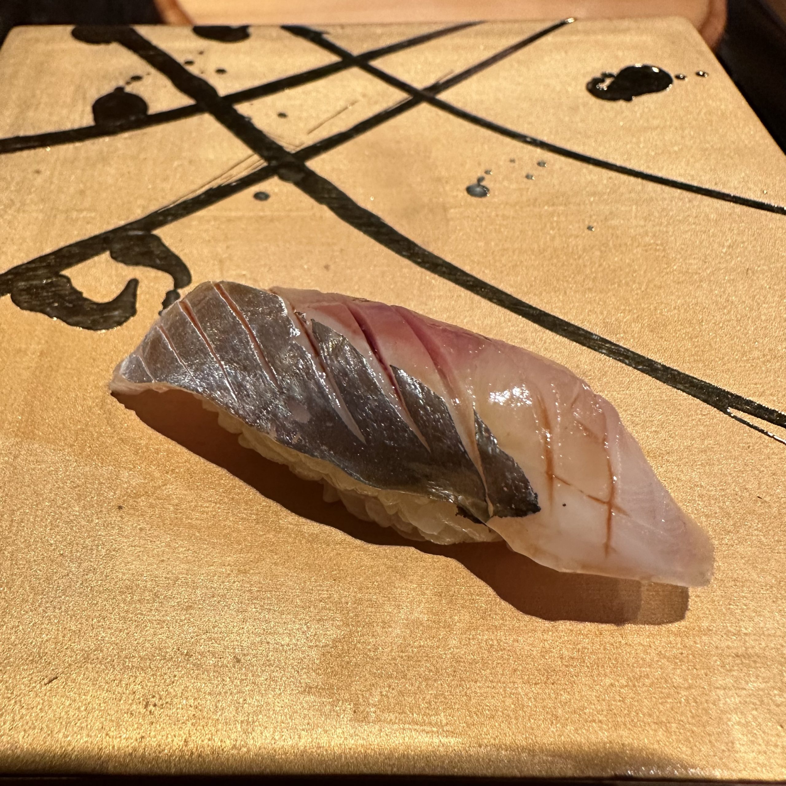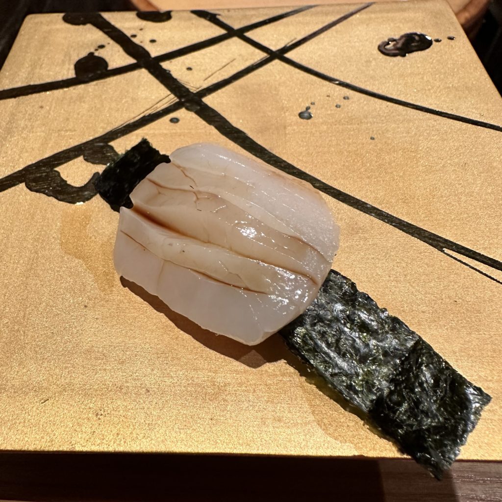 Scallop, Golden Eye Snapper, Eel, Mahi-mahi with zucchini, Uni, Blue fin tuna marinated for 2 weeks with shiso flower, Sea Bream aged 2 weeks, Striped Jack and Sockeye Salmon.