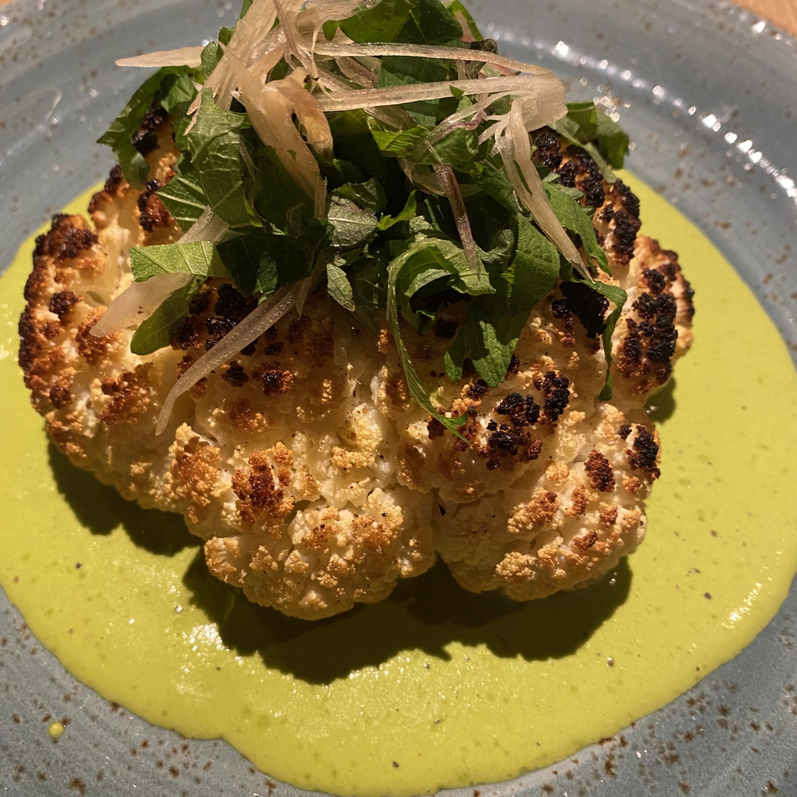 The delectable Roasted Cauliflower was plated with goat cheese and shishito-herb vinaigrette ($32).