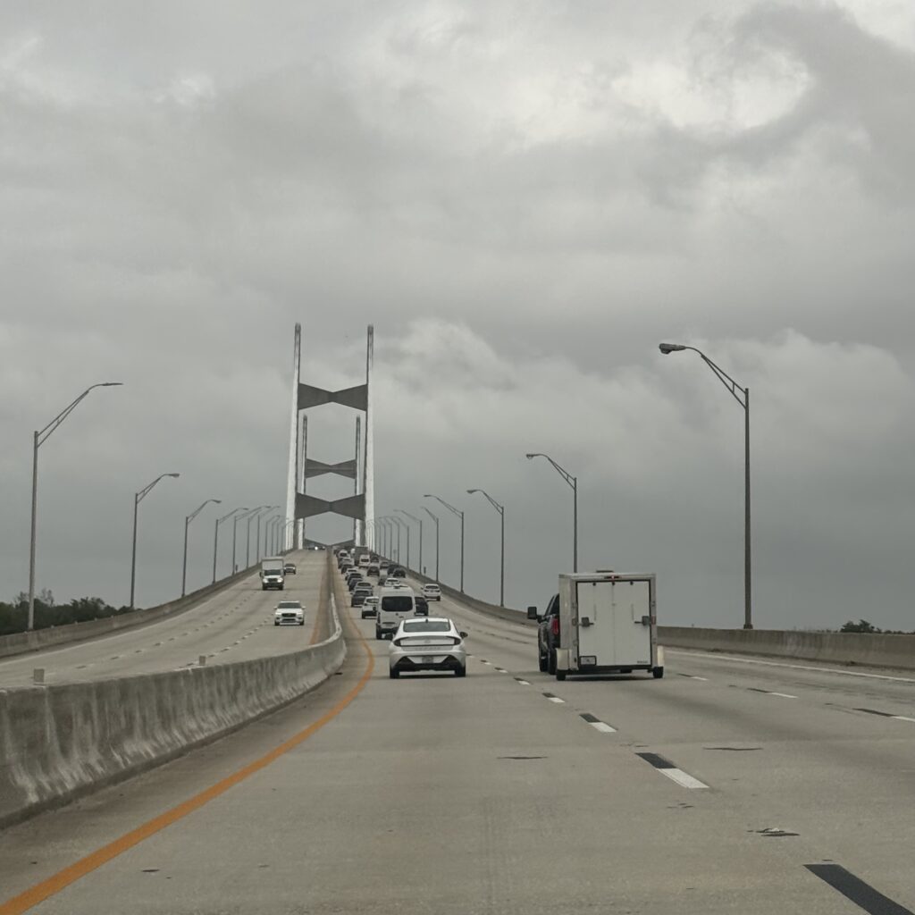 Onward…We left Florida at 7 a.m. in full biblical rain. The vintage Jaguar handled it with quiet dignity. The other drivers? Let’s just say Darwin is taking notes.