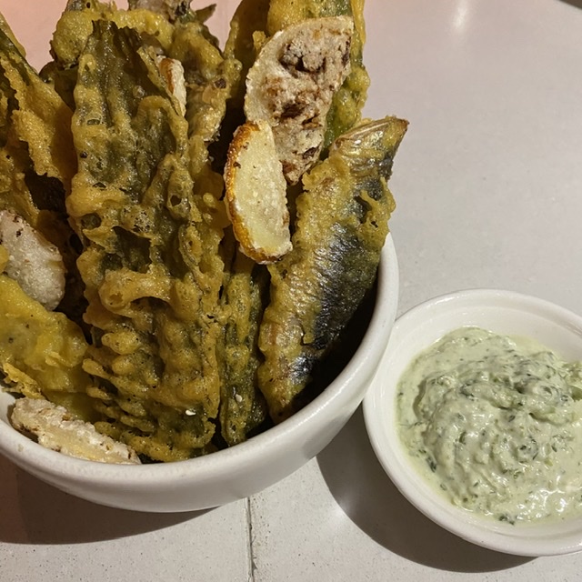 We ordered the tangy, salted, popular Fish Hiding Under Kelp which is a lightly fried piece of kelp dotted with anchovies that are culled locally and weather permitting a diver searches for the tiny anchovies daily ($16).
