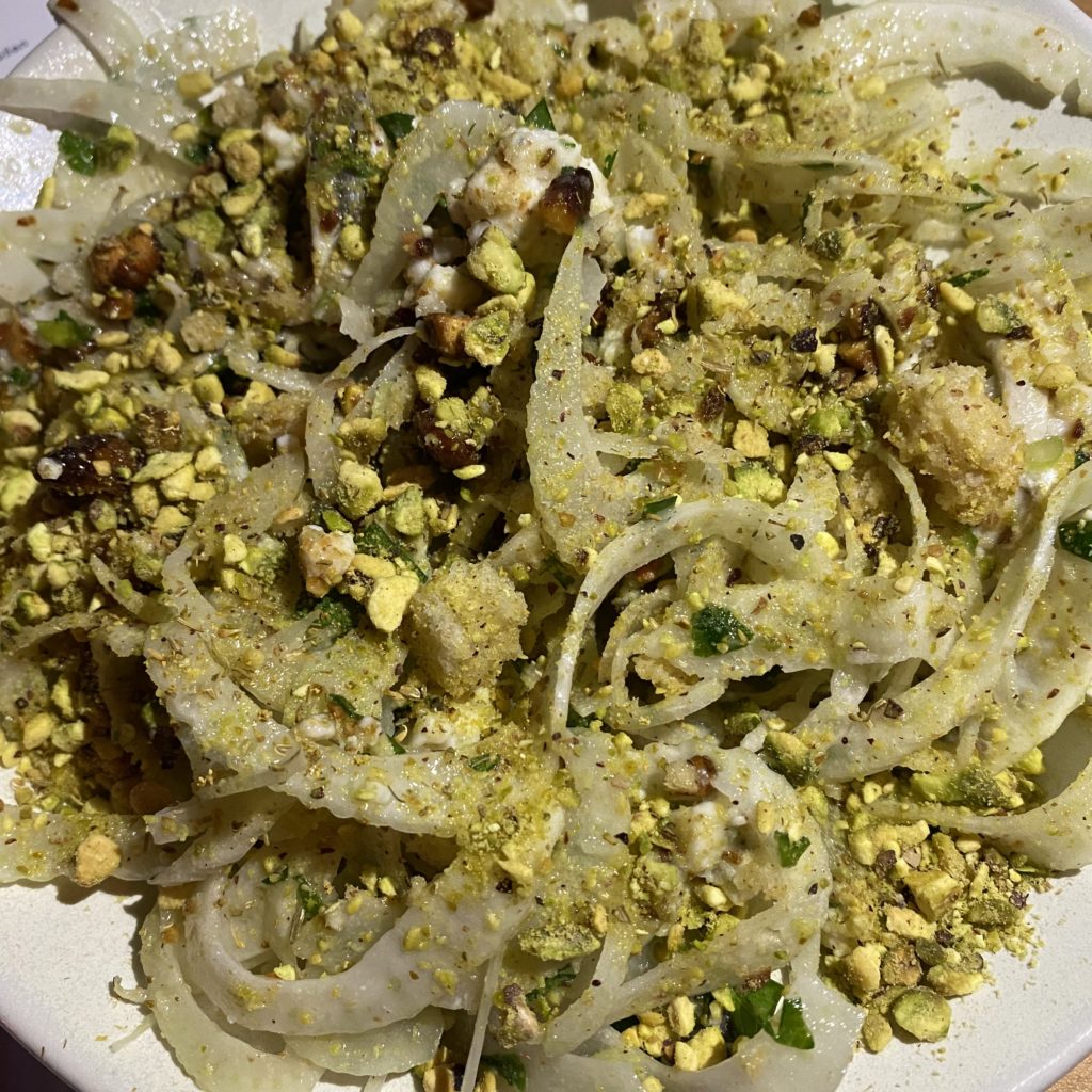 The Shaved Fennel Salad grew on me once I was able to locate the bleu cheese. The salad was comprised of white anchovy and candied pistachios with a yuzu vinaigrette dressing ($18).