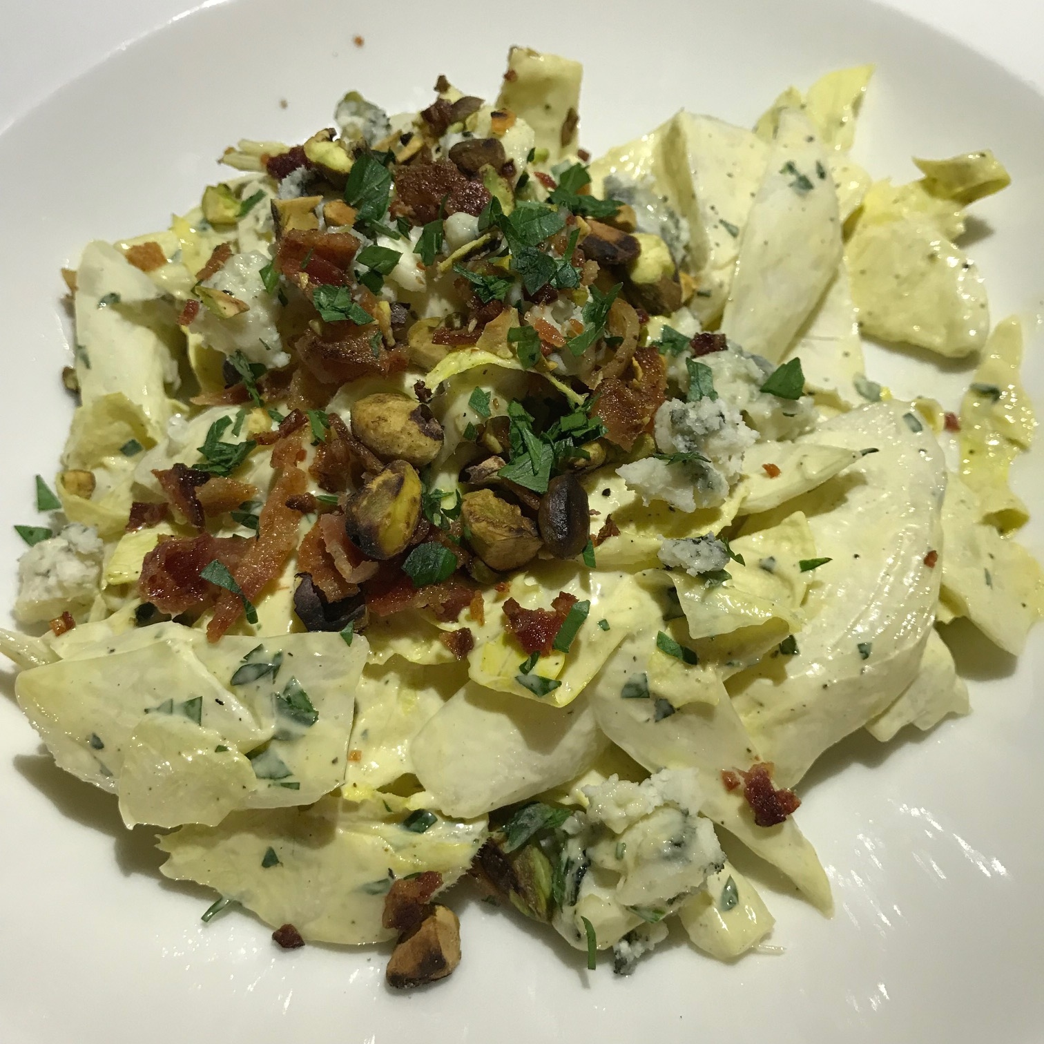 Our first course was a lovely Endive Salad with Roquefort, Pistachios and Crispy Bacon ($15).