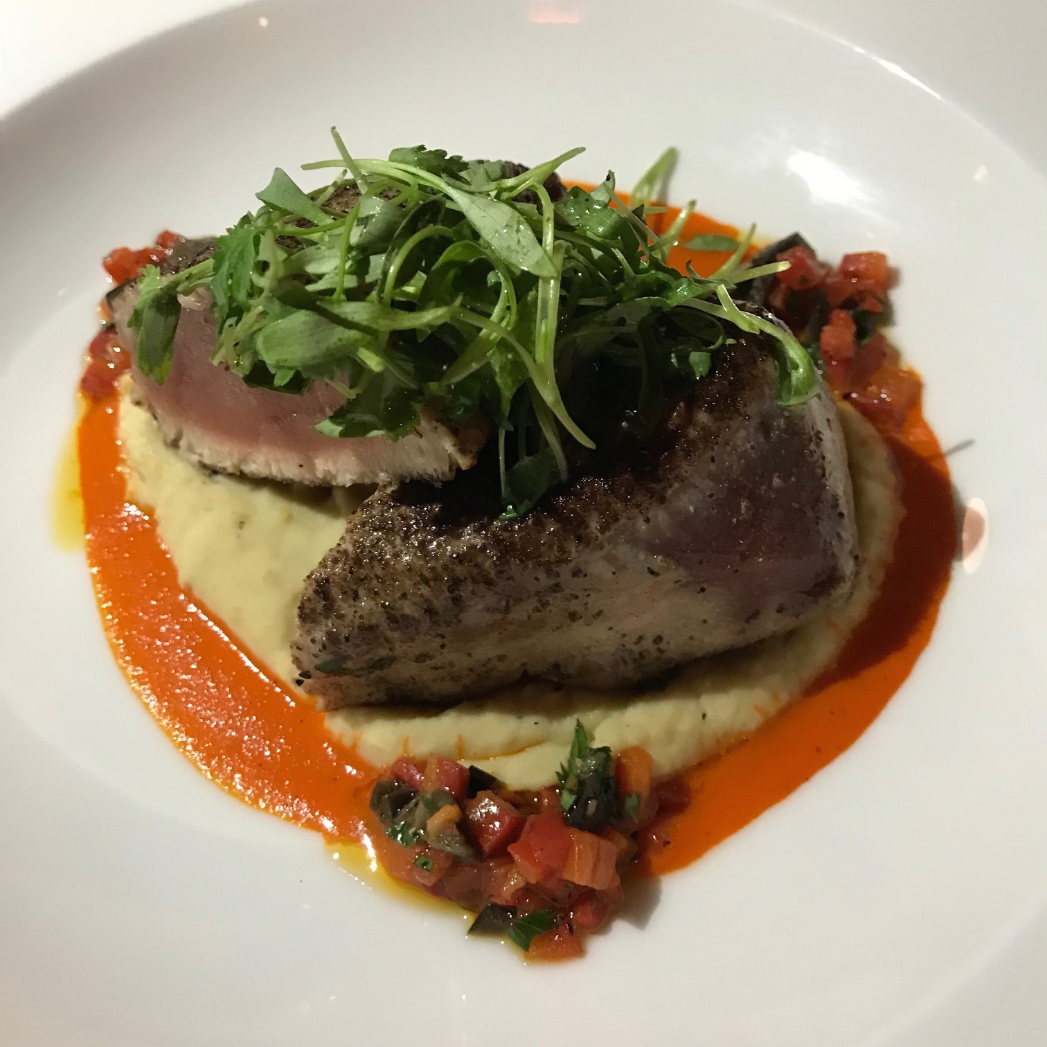 The main course was disappointing. I prepare a tastier seared Yellowfin Tuna ($31). It was garnished with Chickpea Puree, Black Olive Relish and a Red Pepper Coulis which I am allergic to.