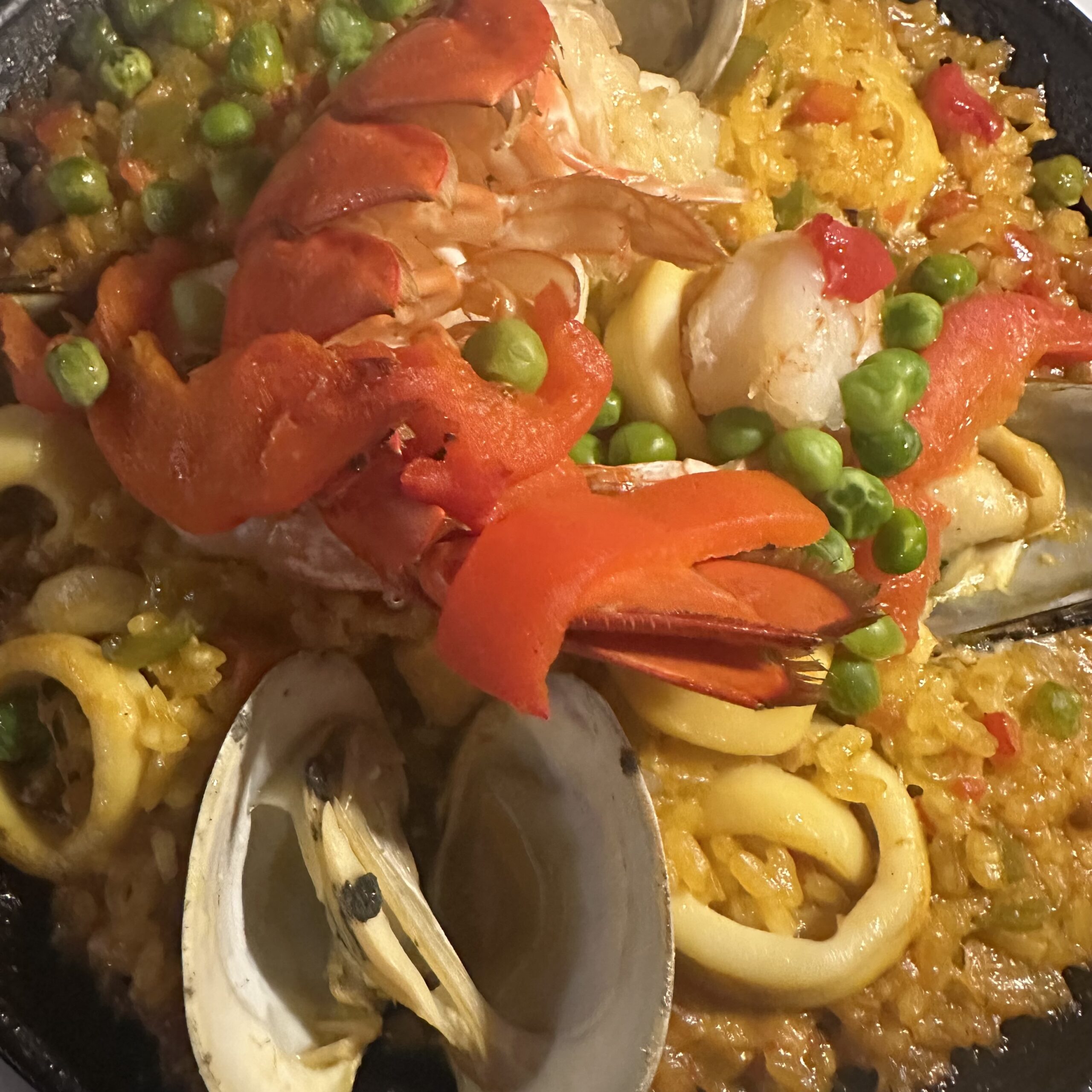 The Paella Marinara sounded great. As advertised it took one hour and it was not worth the wait as it was floating in a sea of red peppers. The paella included yellow Saffron rice with lobster, shrimp, scallop, calamari, clams, mussels and mahi. The seafood was dry and the garlic was as prevalent as ICE in minority neighborhoods ($36).