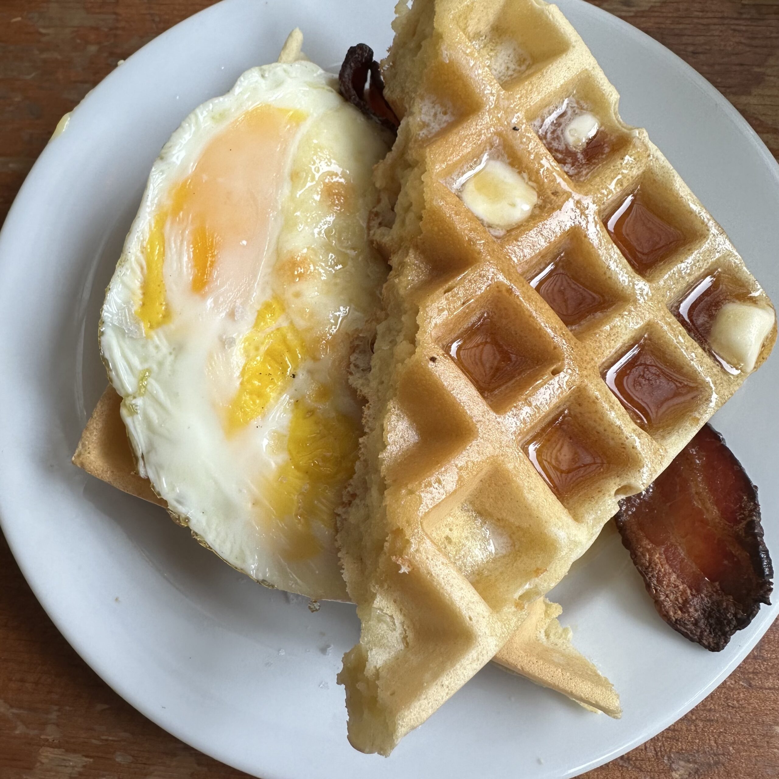 The ambiance is fabulous as well as my Waffle Sandwich comprised of a light as air buttermilk waffle, sunny-side organic eggs, savory smoked bacon, gruyere & delicious maple syrup ($19).