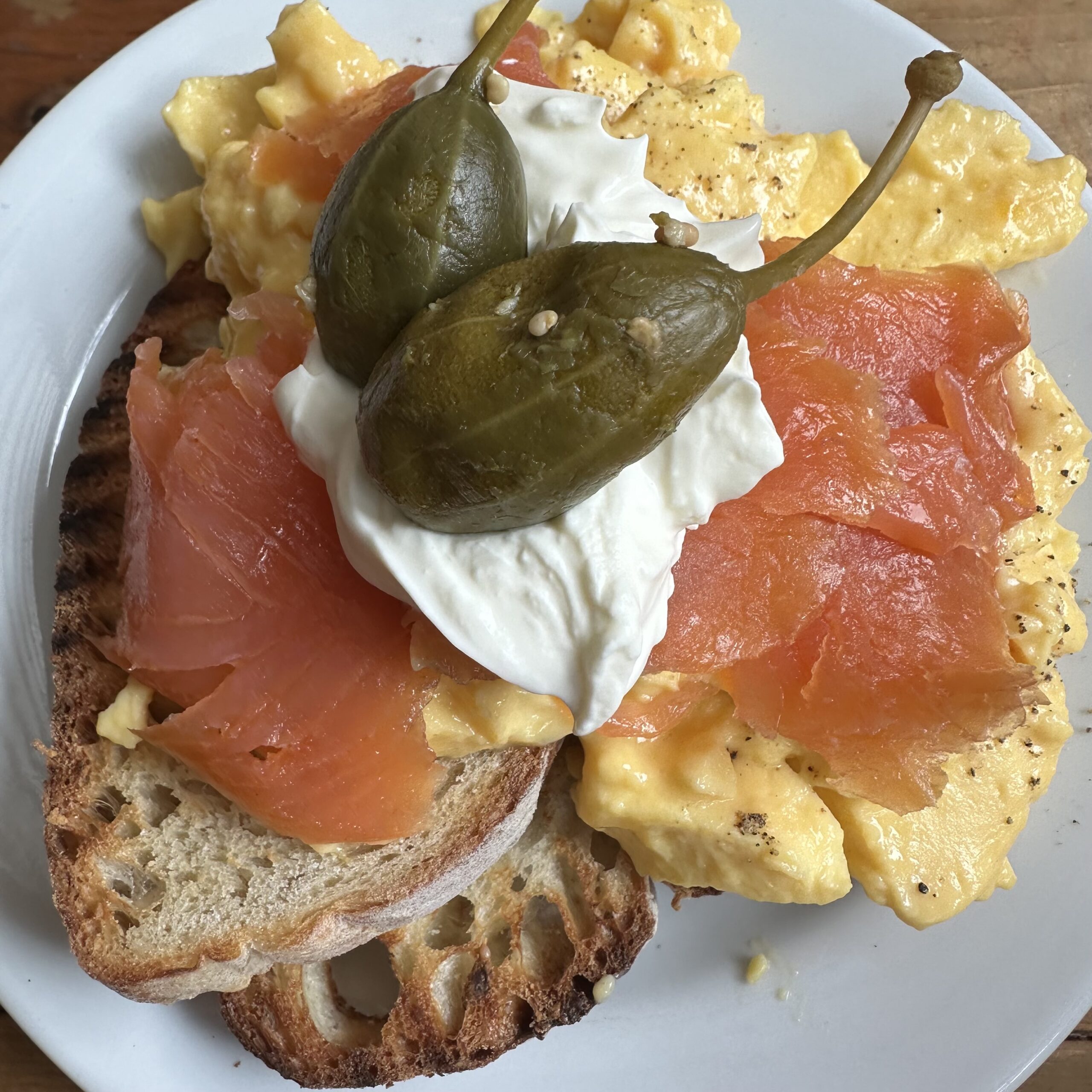 My dining companions ordered a delectable Saumon Fume with smoked salmon, capers and creme fraiche with scrambled eggs on freshly baked bread ($19).