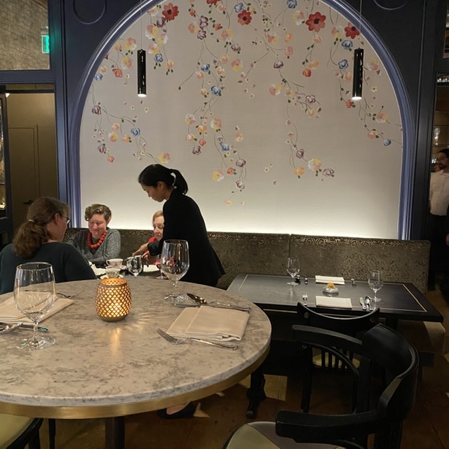 Formerly home to a burger joint, Pasjoli has been transformed with a marble bar, antique mirrors, mohair-upholstered banquettes and silk, hand-painted floral wallpaper.