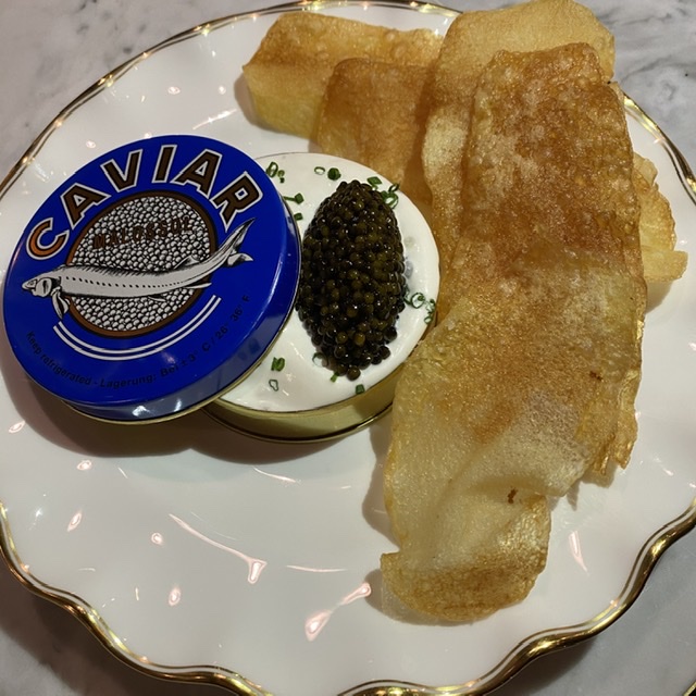 The presentation of Golden Osetro Caviar with horseradish cream, smoked sturgeon, cucumber and brown butter potato chips was attractive and appealing ($68).