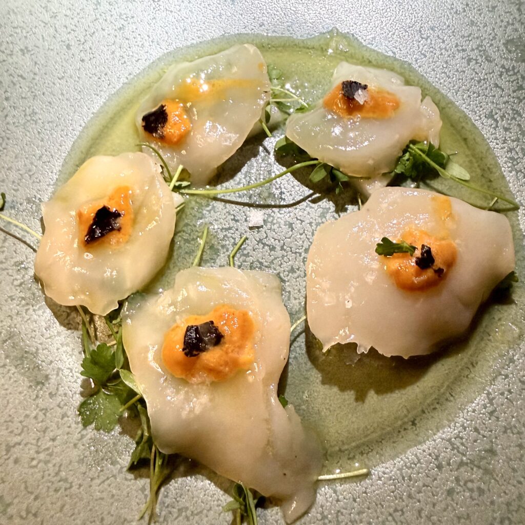 The first course was an enticing Crudo consisting of a luscious sliced fresh scallop on a Shinto pear base topped with Uni and shaved truffle and a hint of yuzu. This dish was the only slightly weak link as the truffle overwhelmed the natural seafood flavors ($26).