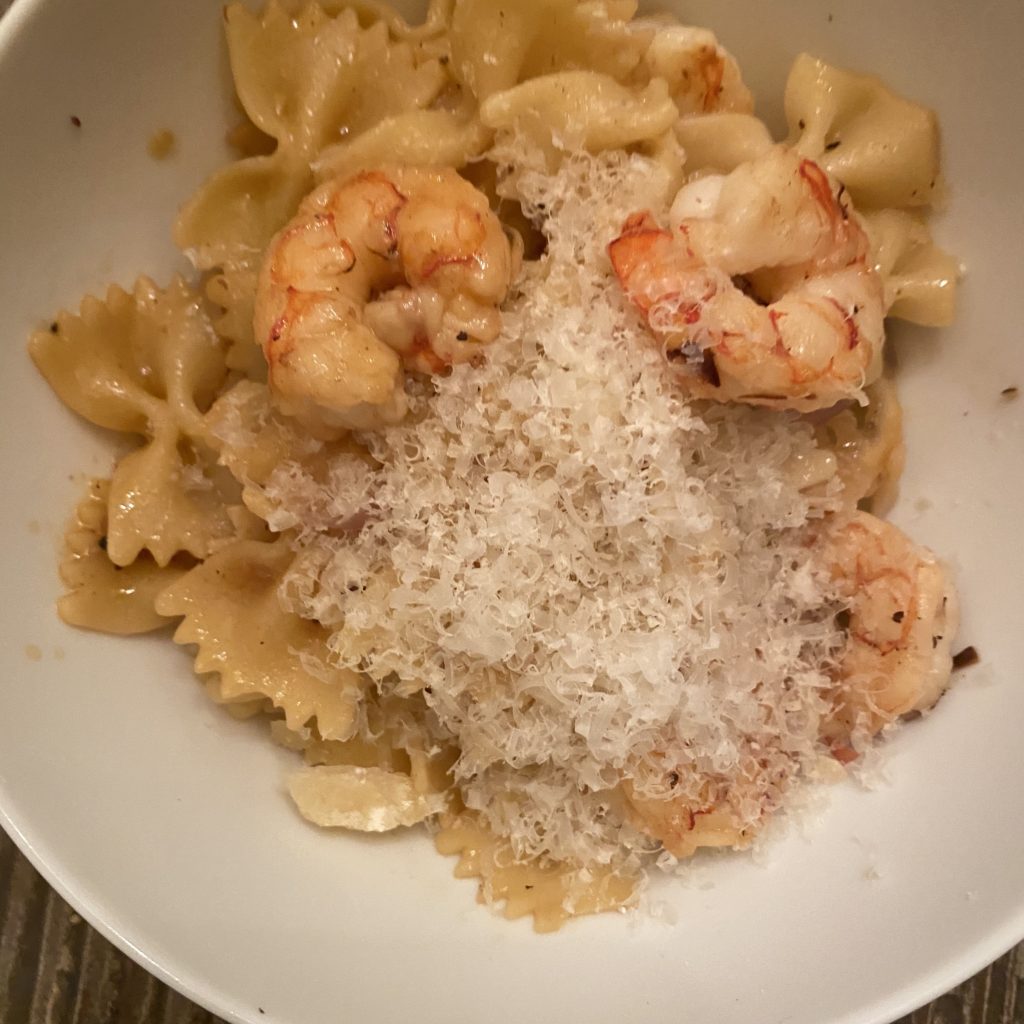 Serve in a bowl dividing up the shrimp and topping with freshly grated Parmesan cheese.