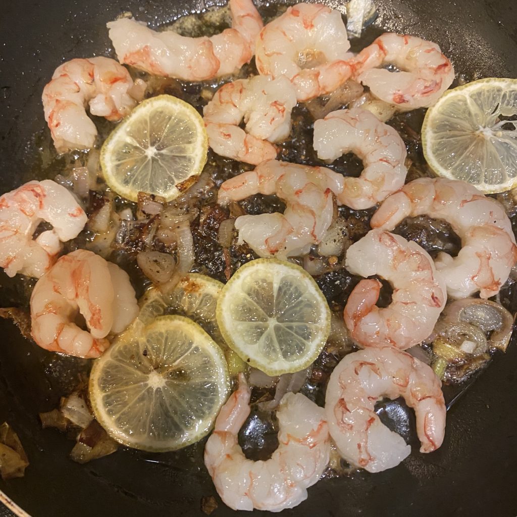 I included 12 large shrimp that I pat dry before searing and arrange in a pan so that each peeled and deveined shrimp has elbow room.