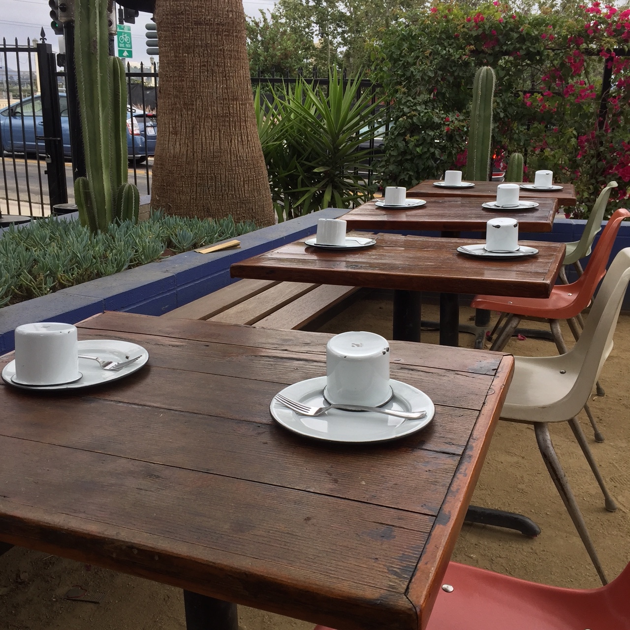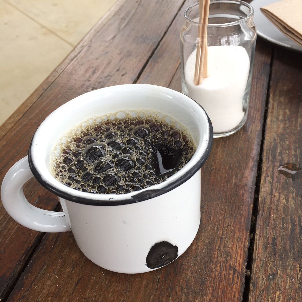 It has a big outdoor area with vintage plastic chairs straight out of a 1970’s cafeteria, rough wooden tables set with metal camping style plates and mugs.