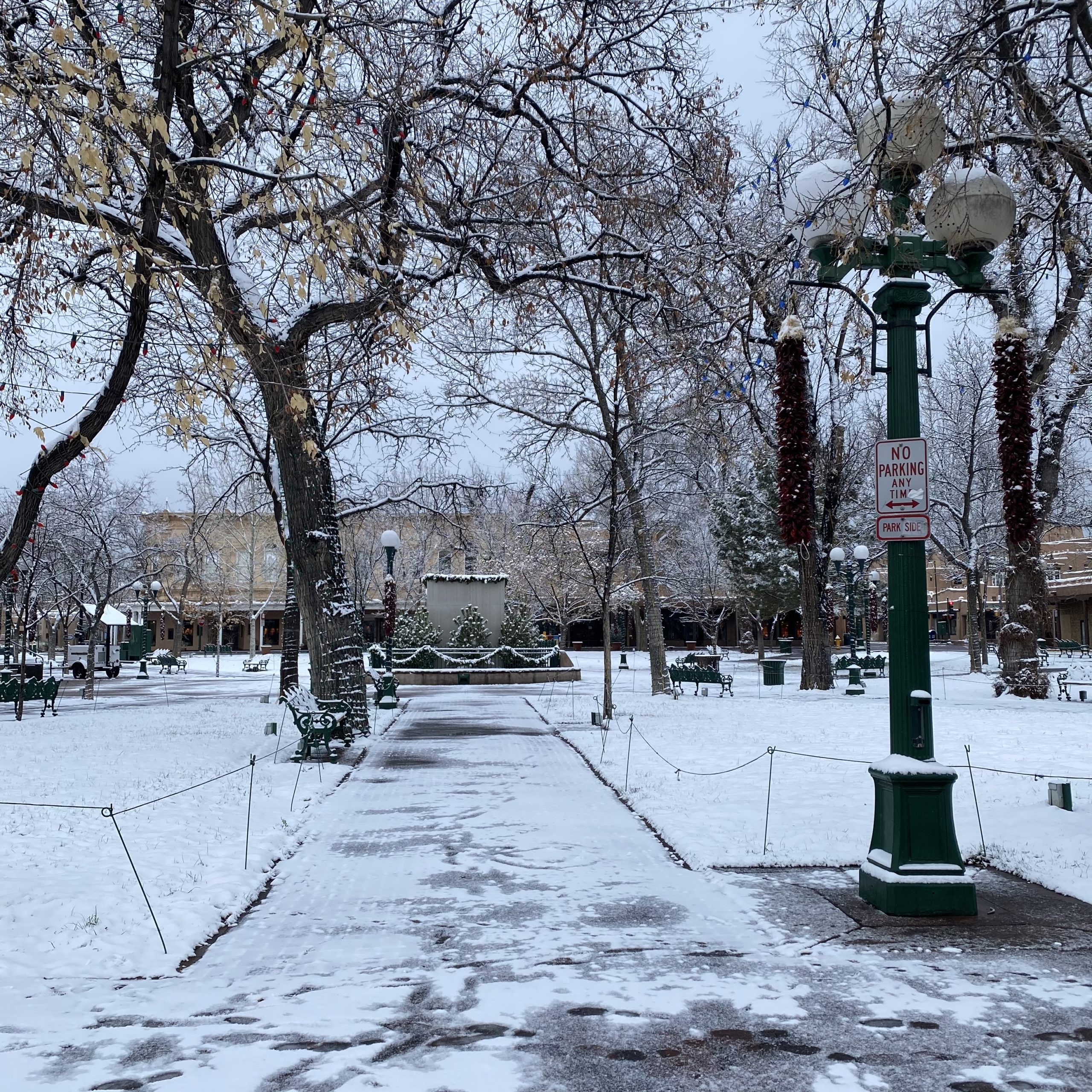 The historic Santa Fe Plaza has been deserted yet welcoming in its quiet beauty.